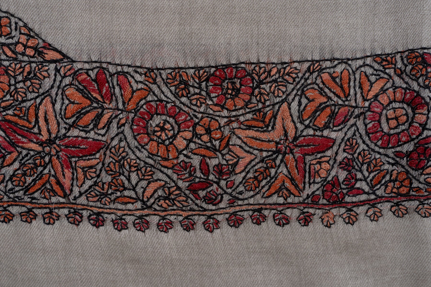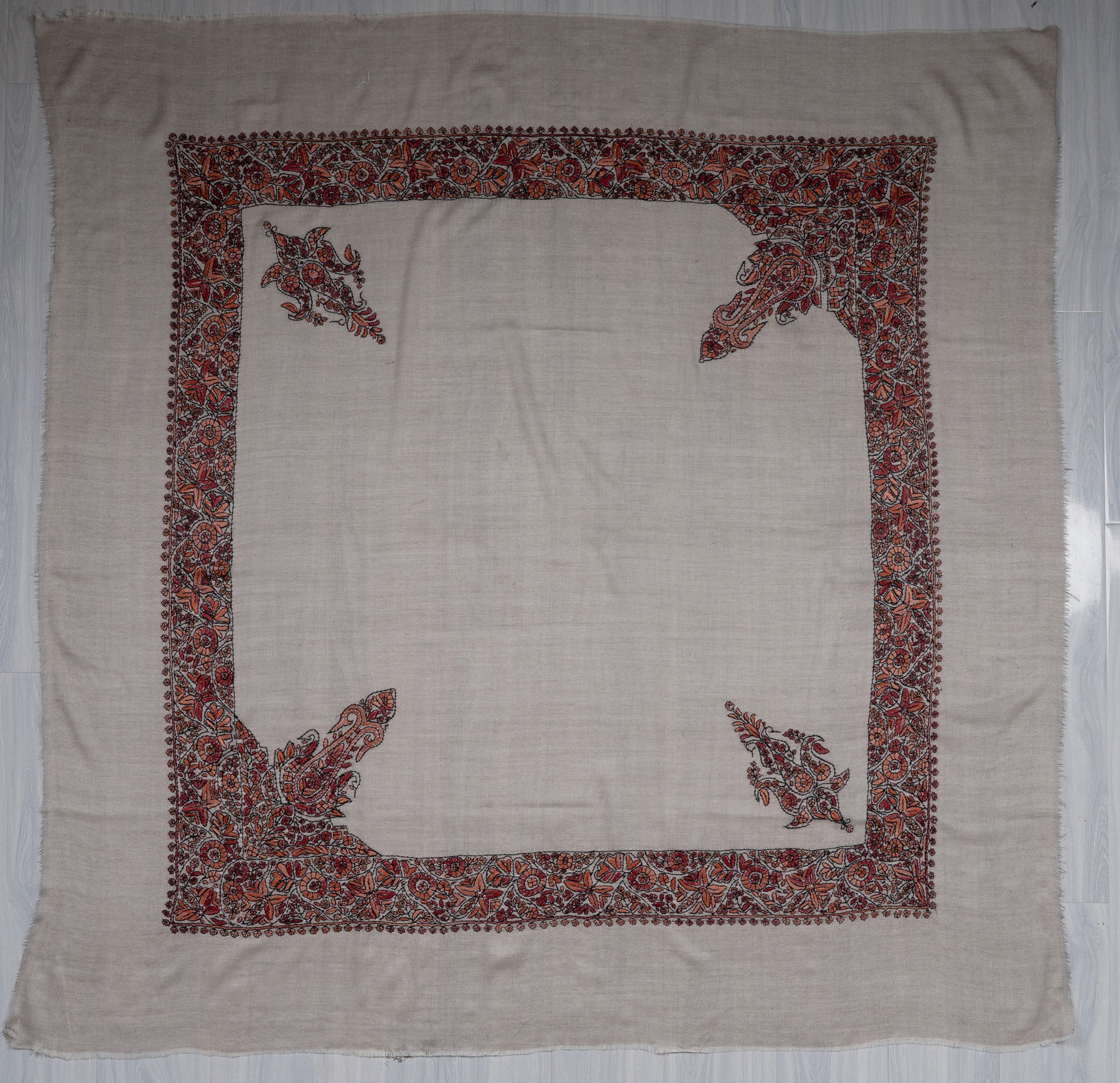Wrap yourself in the elegance of Kashmir with the Sandstone Crimson Rumal — Sozni Hand Embroidered, a masterpiece crafted in 120-count merino wool. Measuring 54 inches, this versatile tarha/hijab features vibrant crimson and orange floral motifs that add timeless charm to its neutral sandstone base.