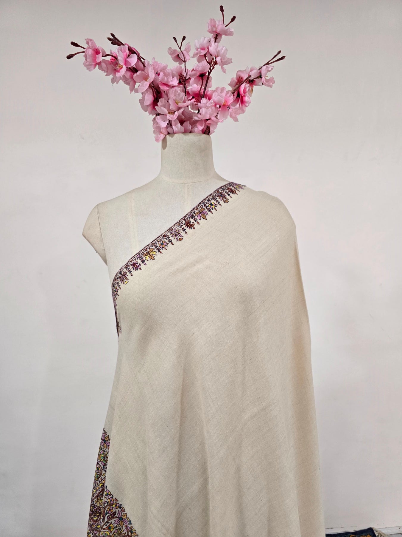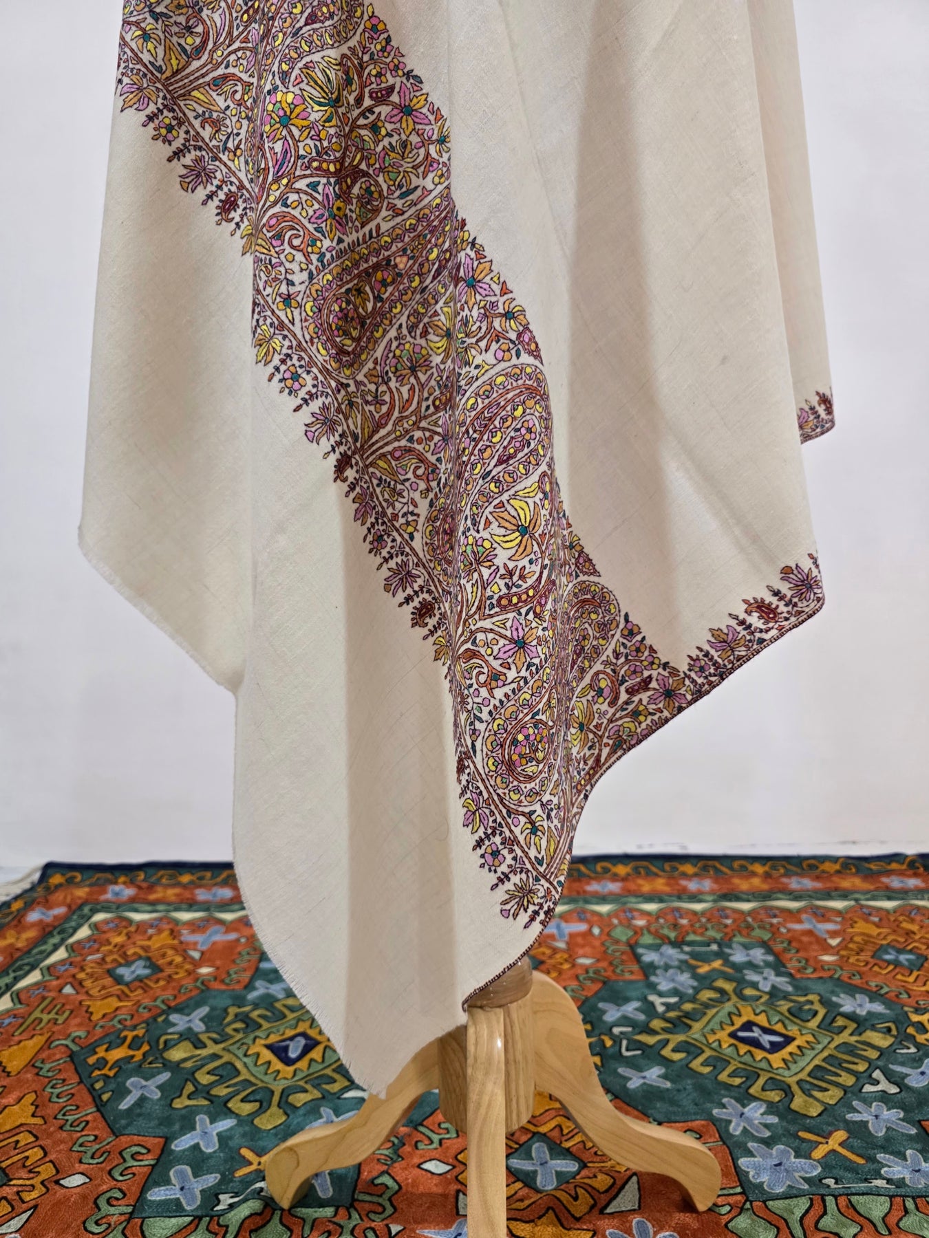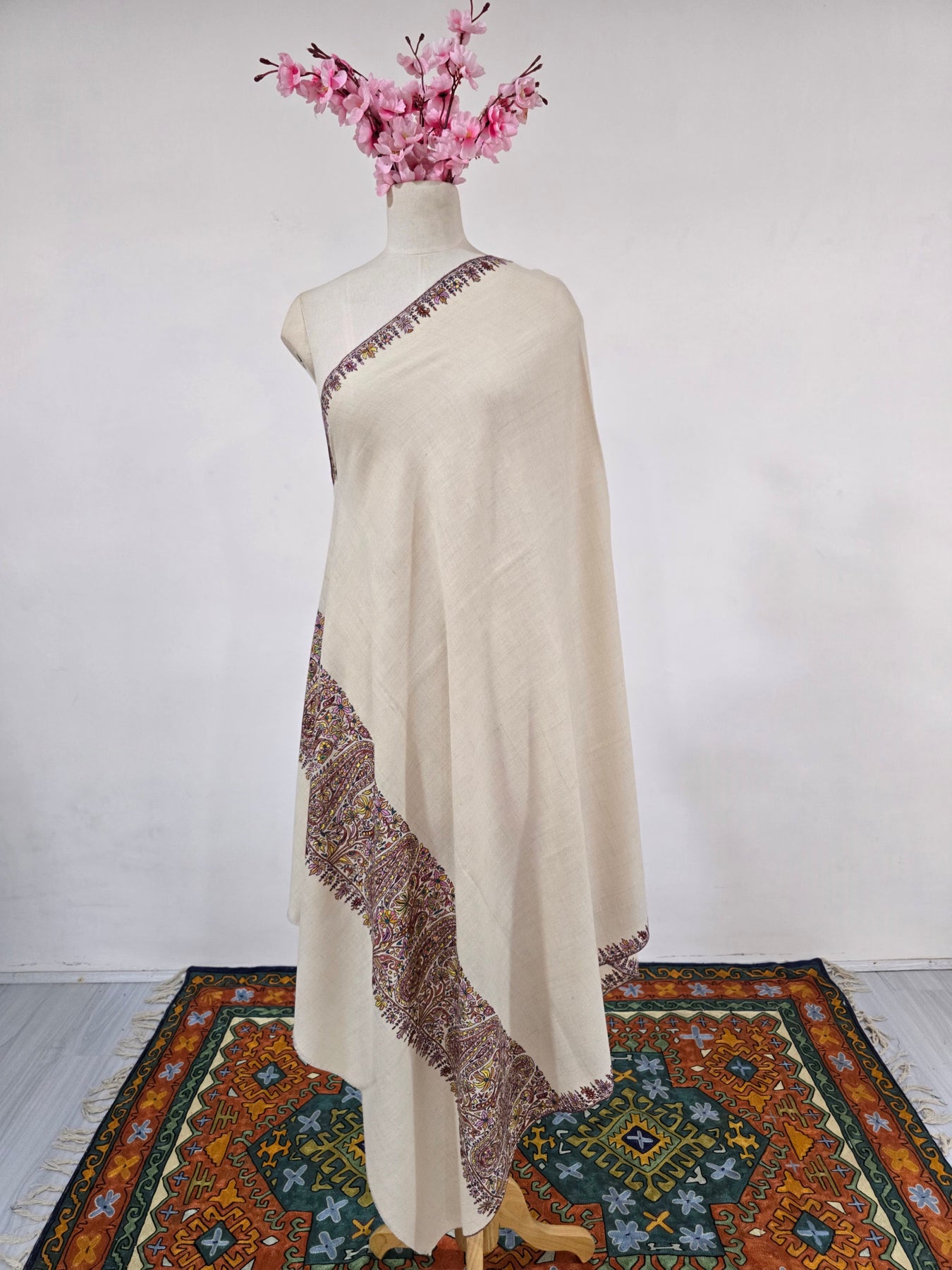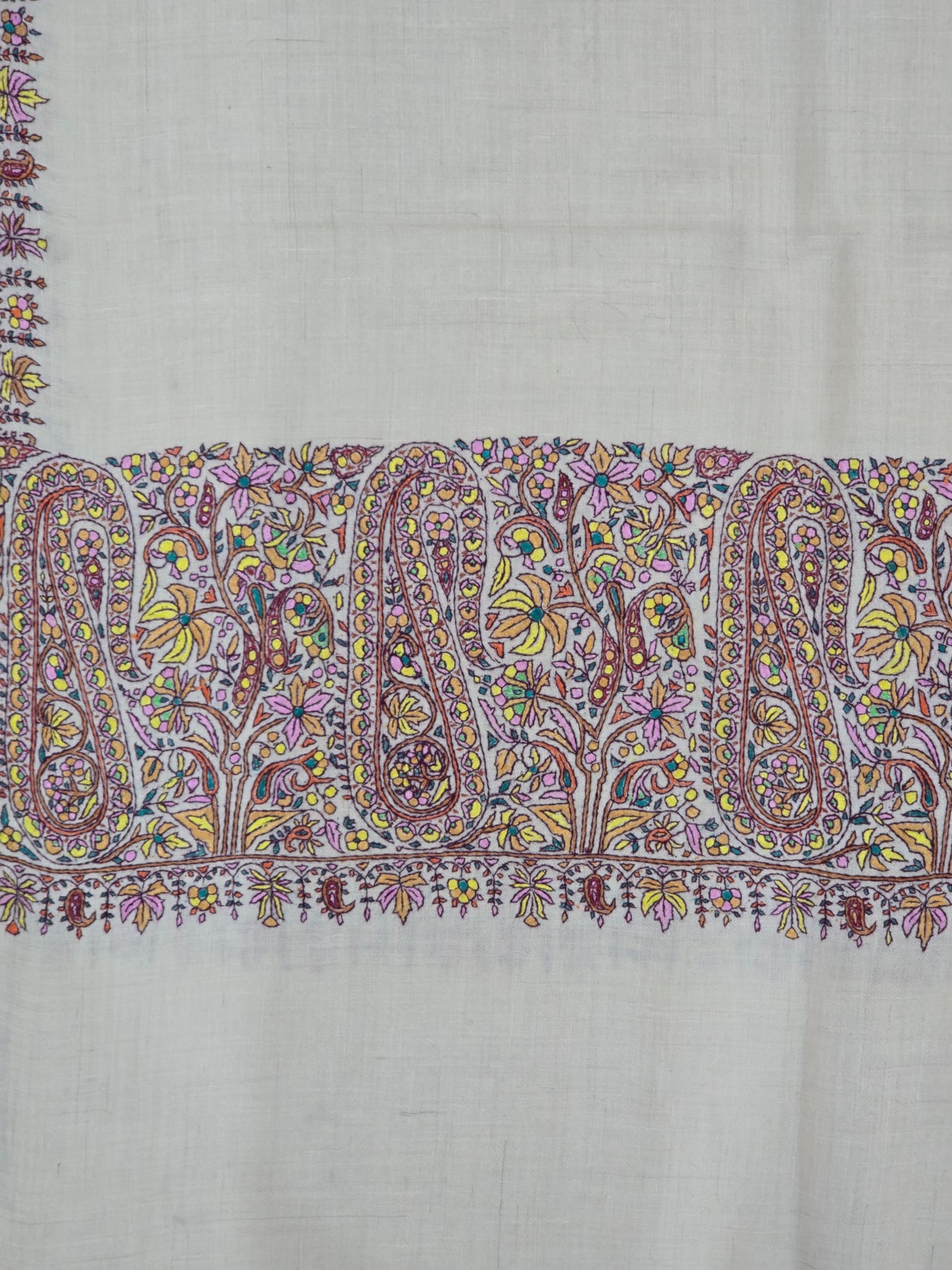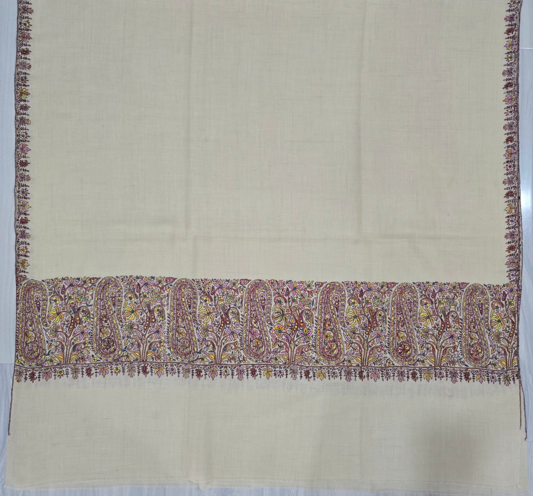 Elegant and expressive, this Pure Pashmina shawl is enhanced with beautifully hand embroidered paisley motifs flowing along its edge. The intricate detailing brings a gentle vibrance to the soft base, making it a versatile piece that captures both tradition and grace.