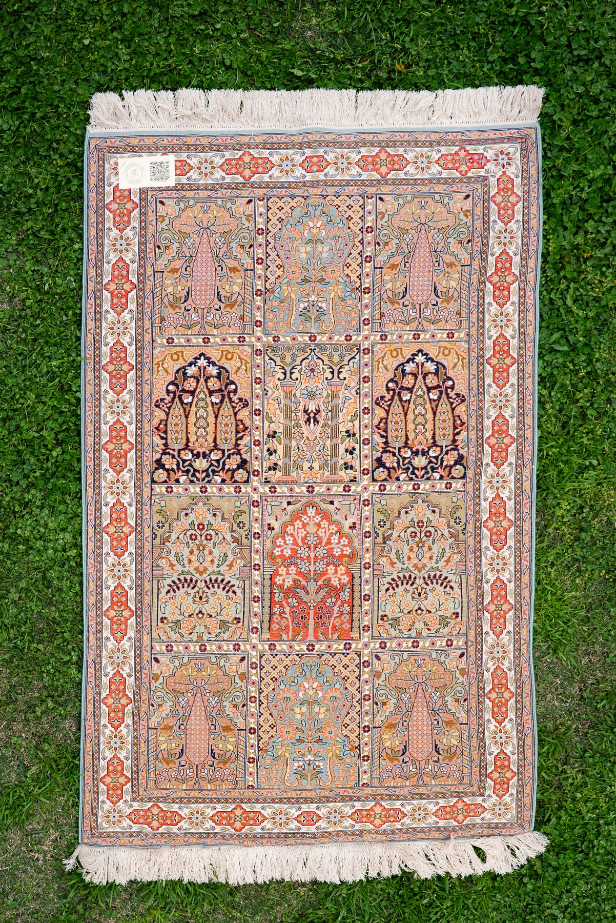 Expertly hand knotted using mulberry silk on silk, it offers a refined texture and luminous clarity. A versatile piece that blends traditional artistry with a contemporary sense of order.