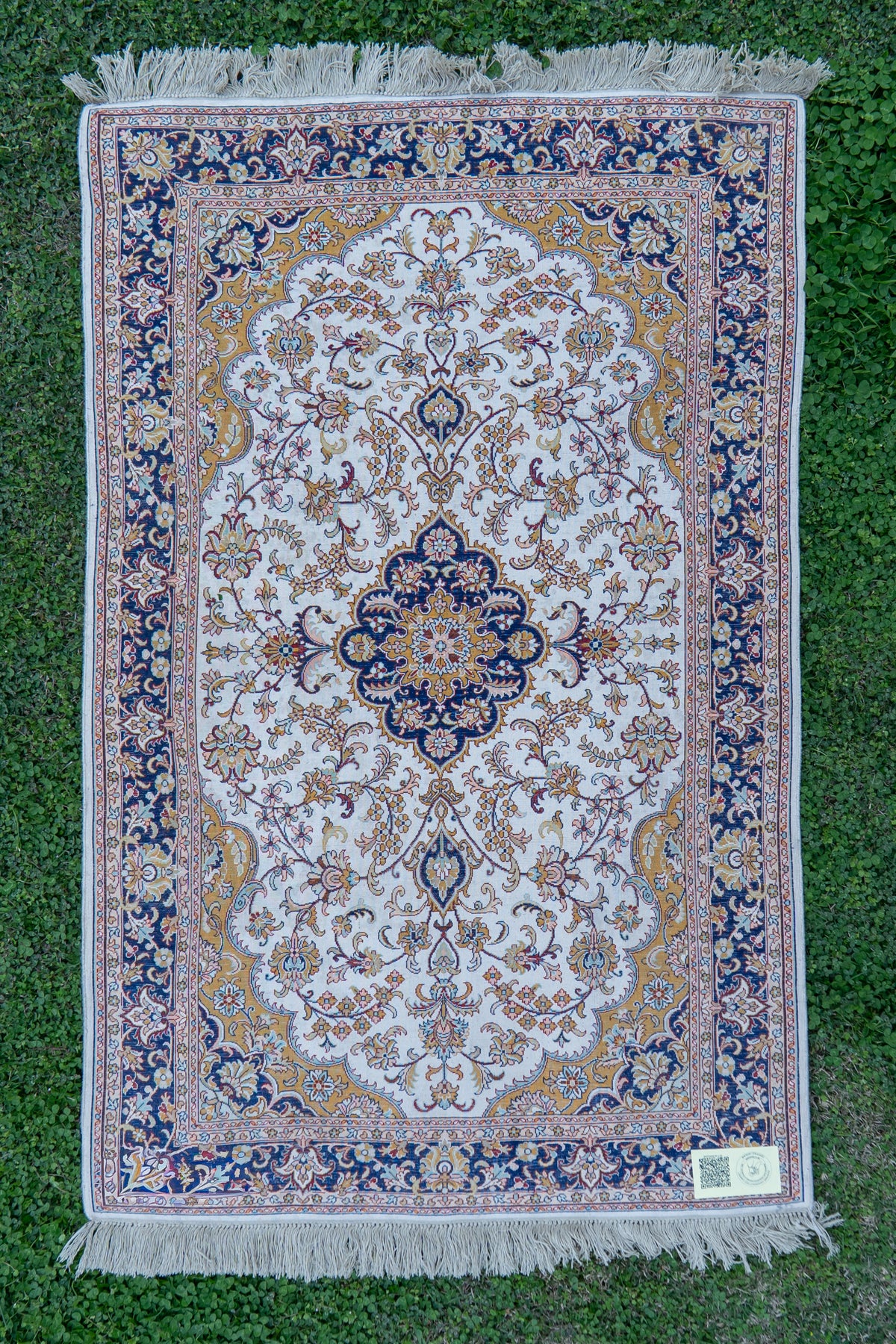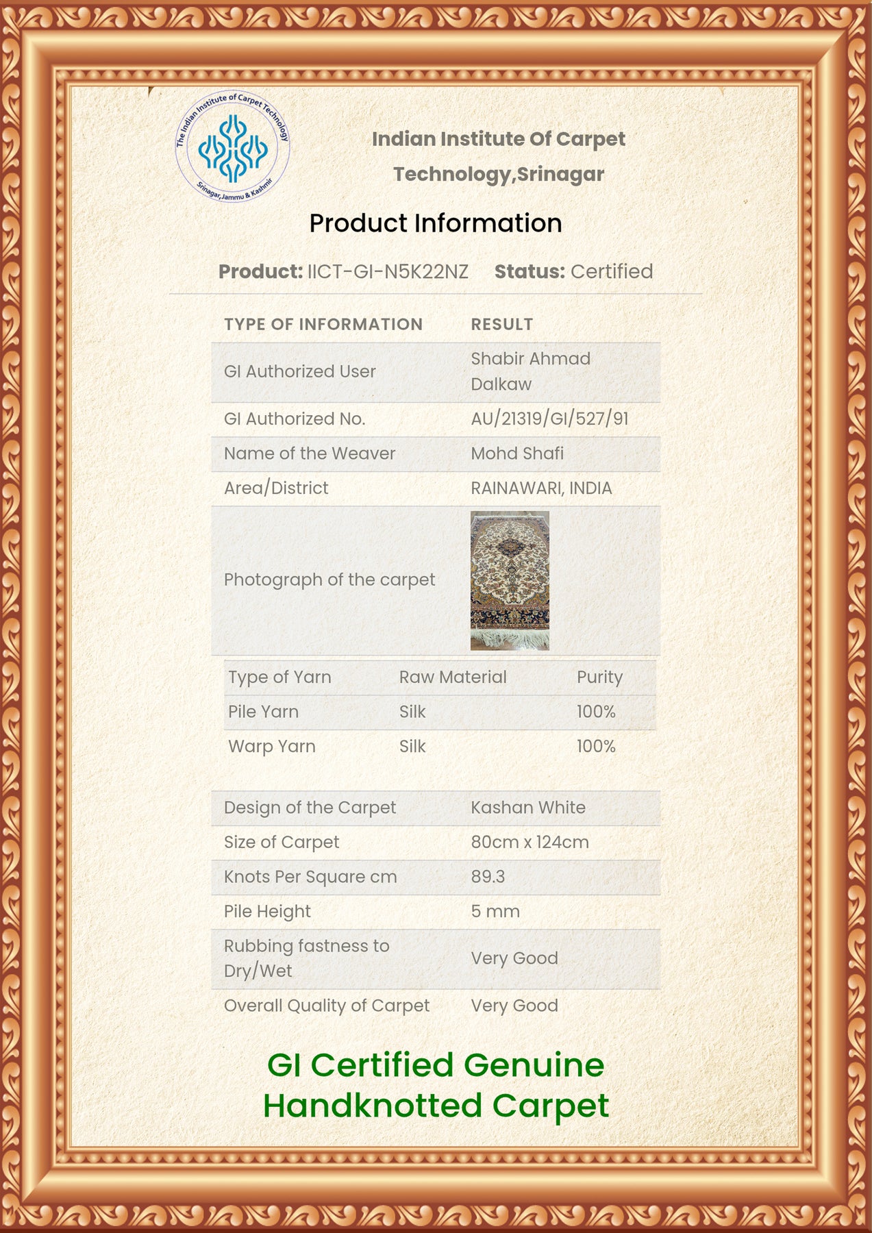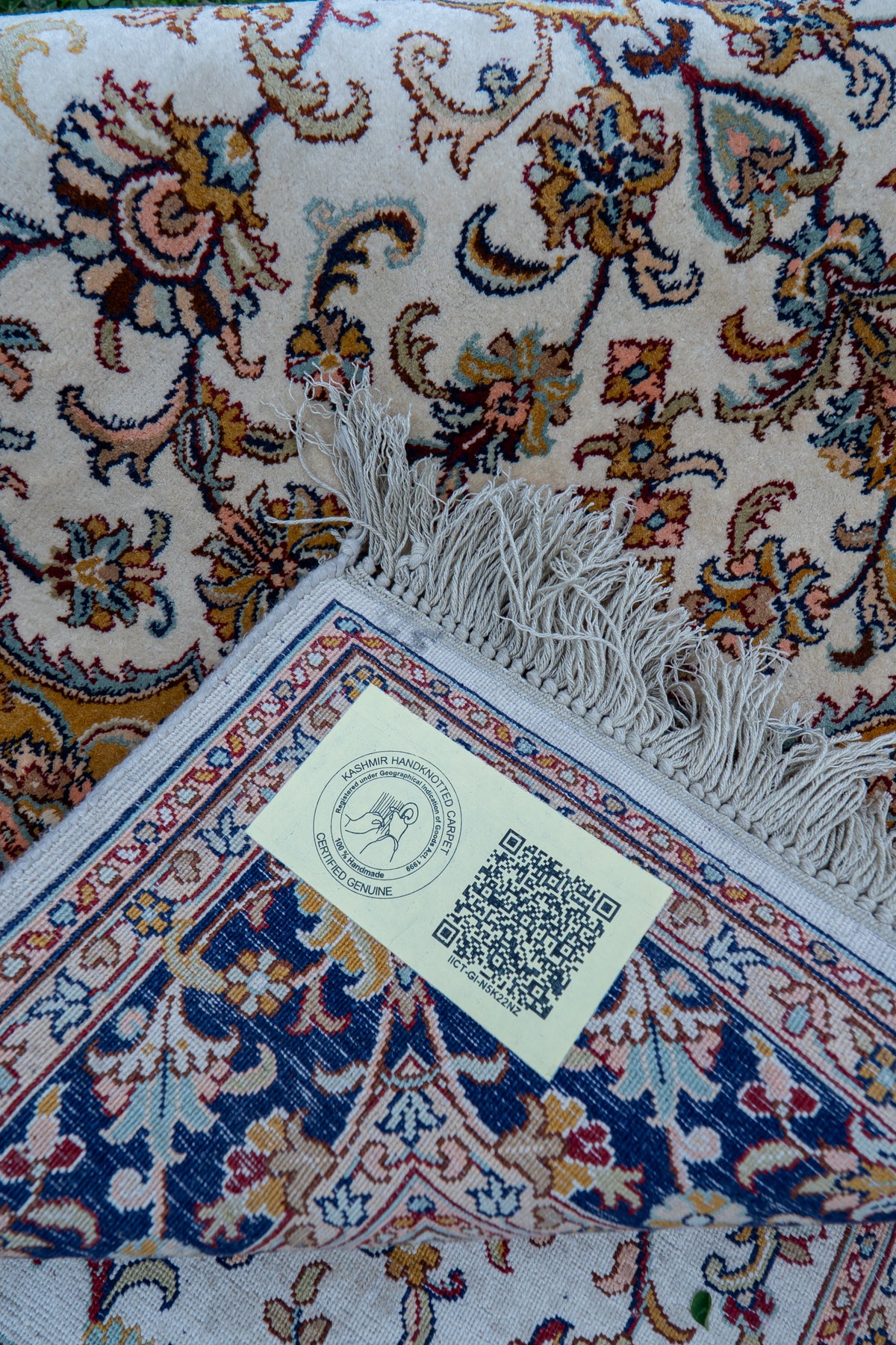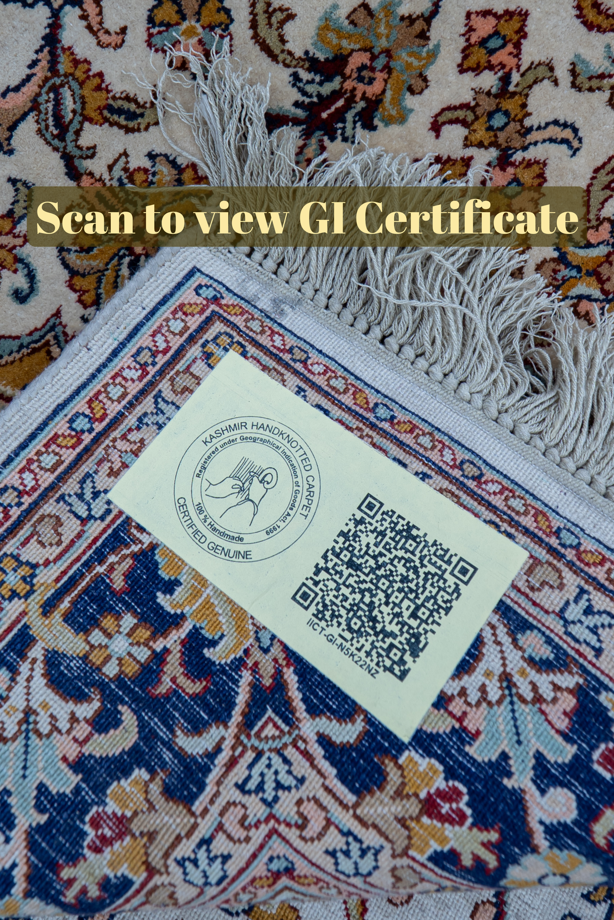 To guarantee authenticity, every Pure silk on silk carpet is accompanied by a Geographical Indication (GI) Certificate, issued by the Government of India. This certificate confirms that this carpet is a 100% Pure silk carpet and is Hand-knotted, and Hand-Crafted by local Artisans in Kashmir valley.