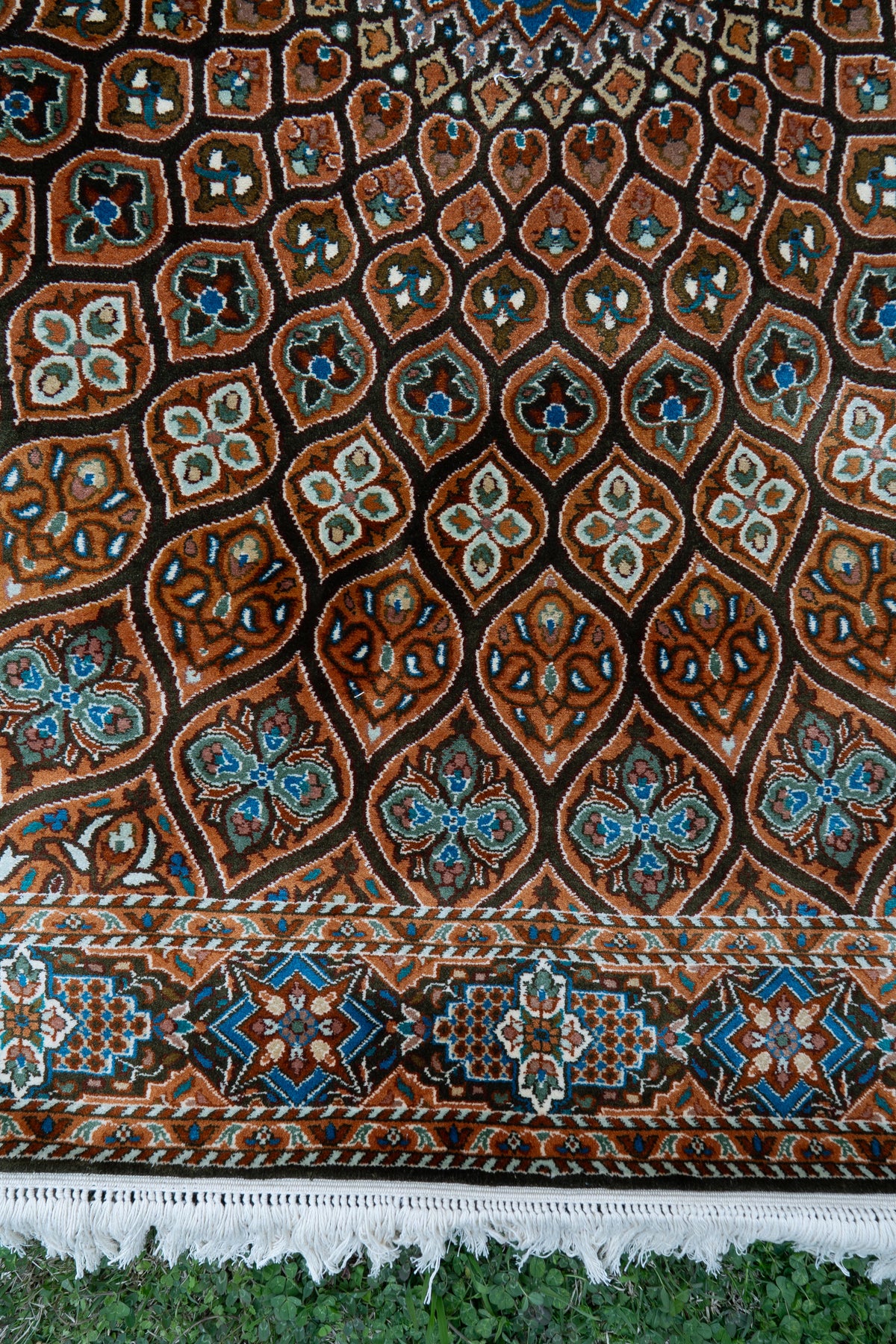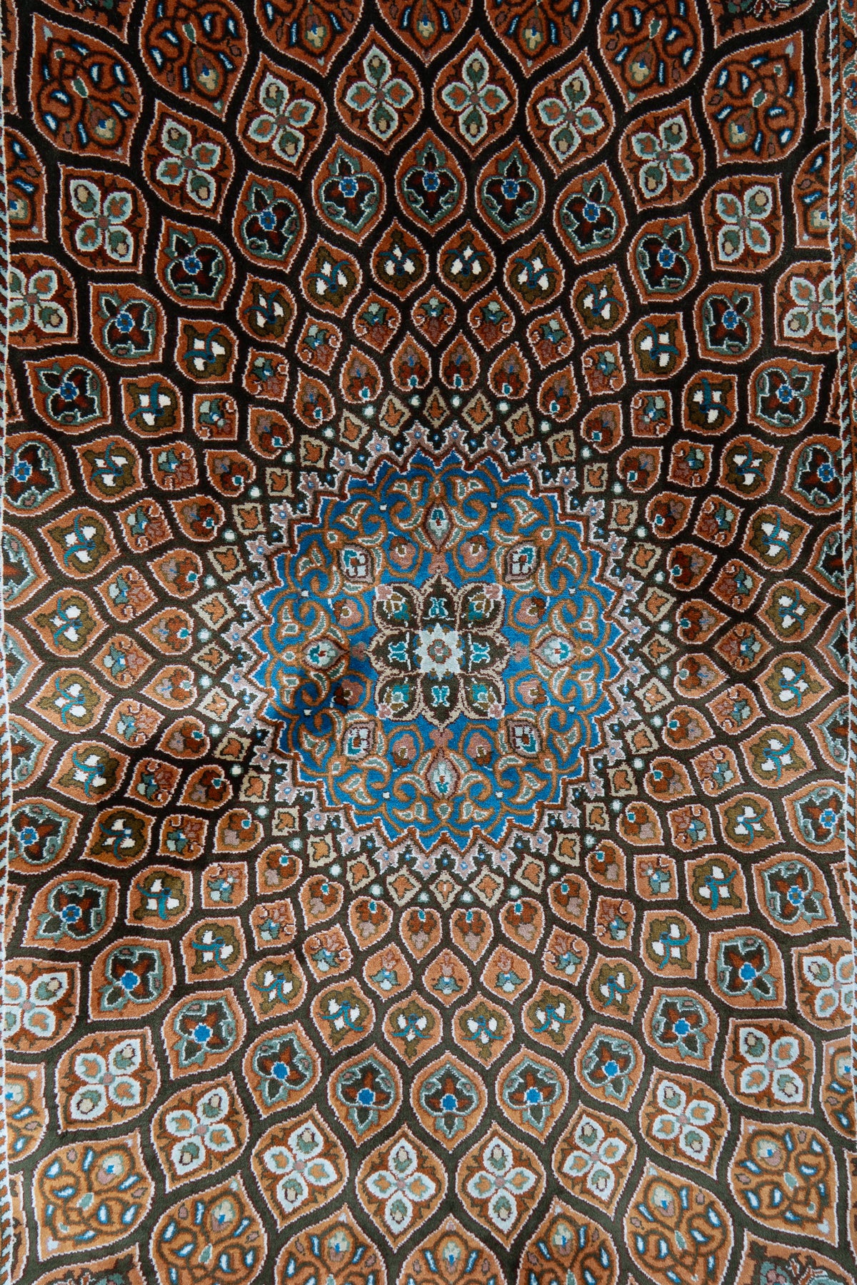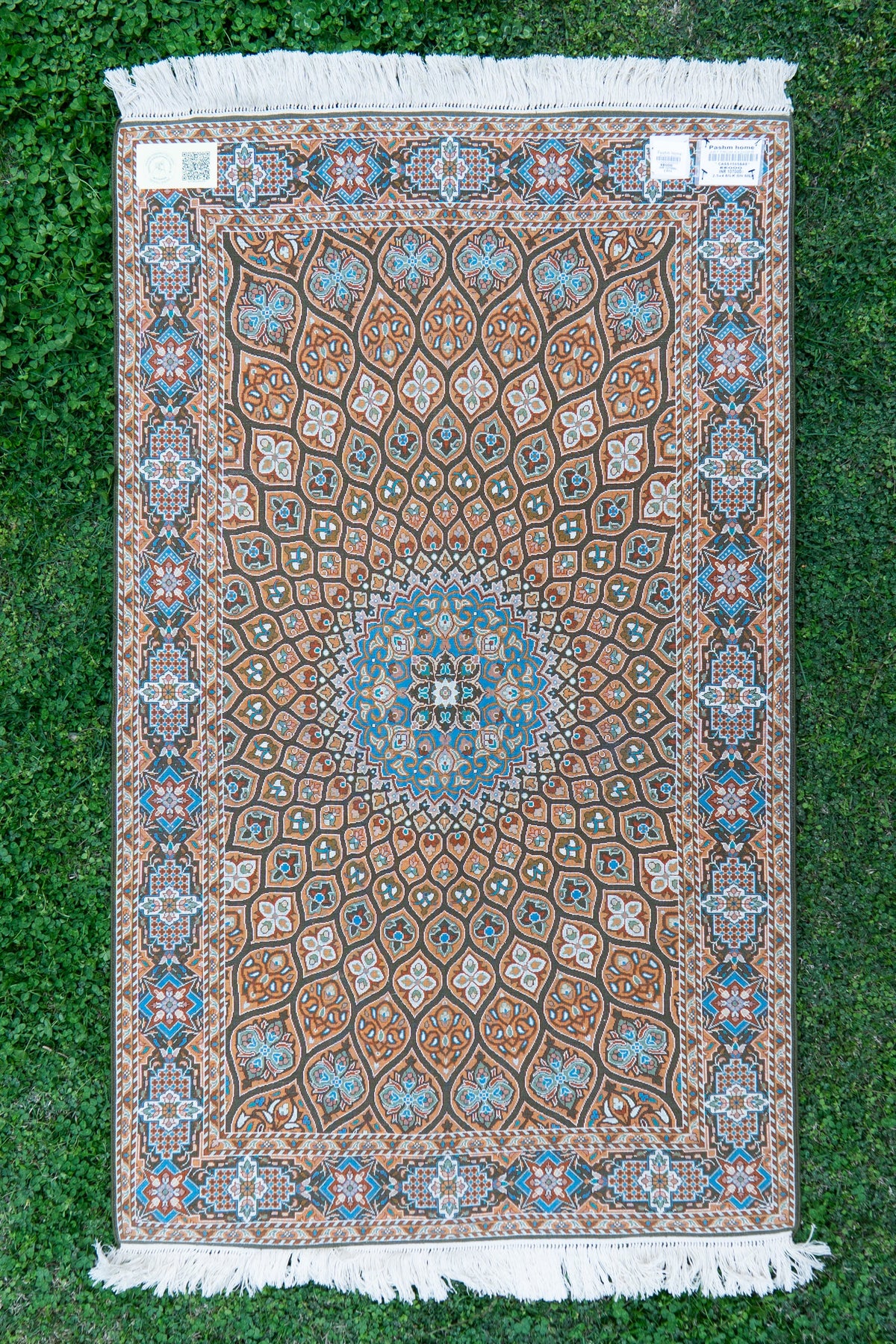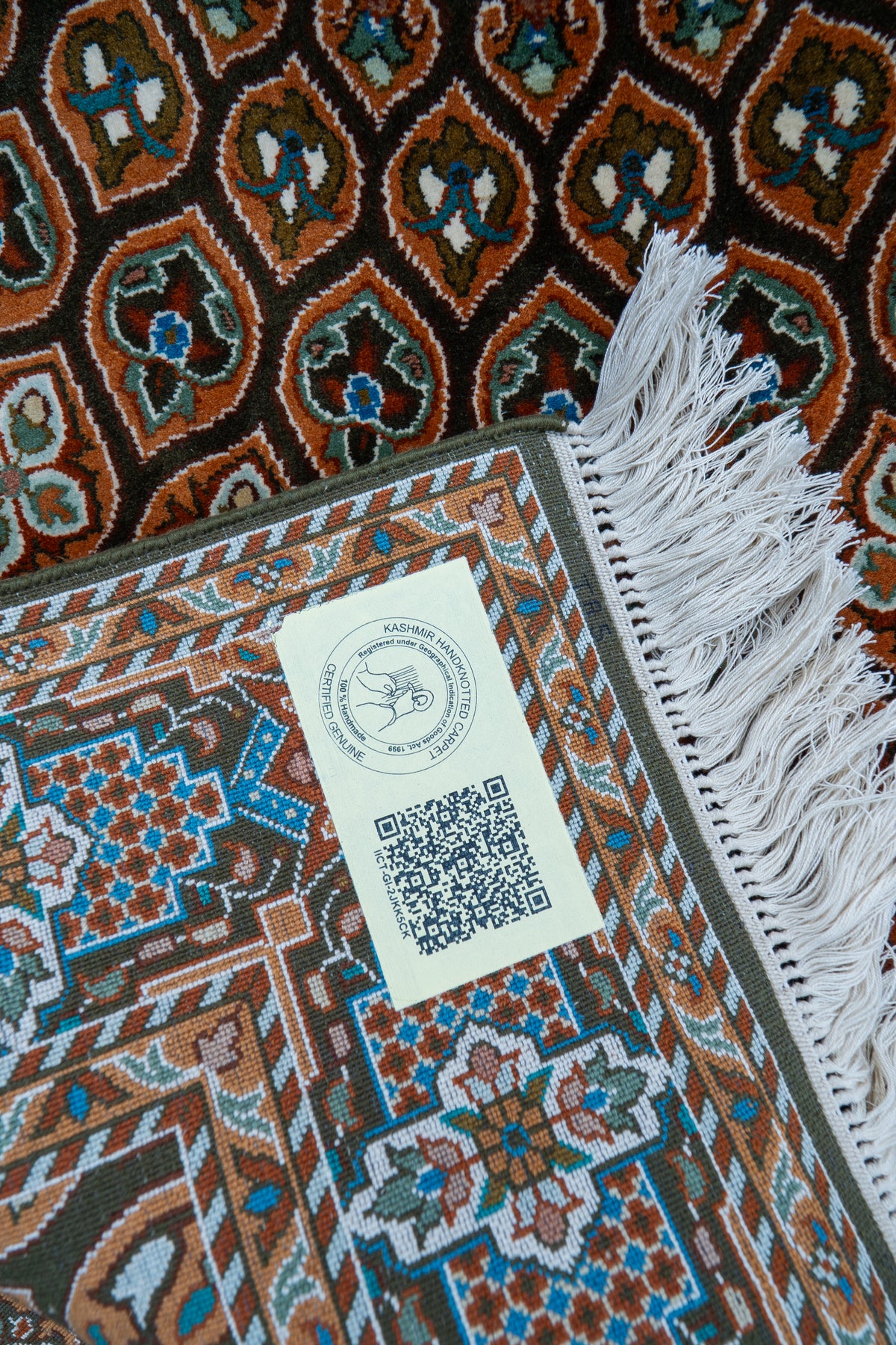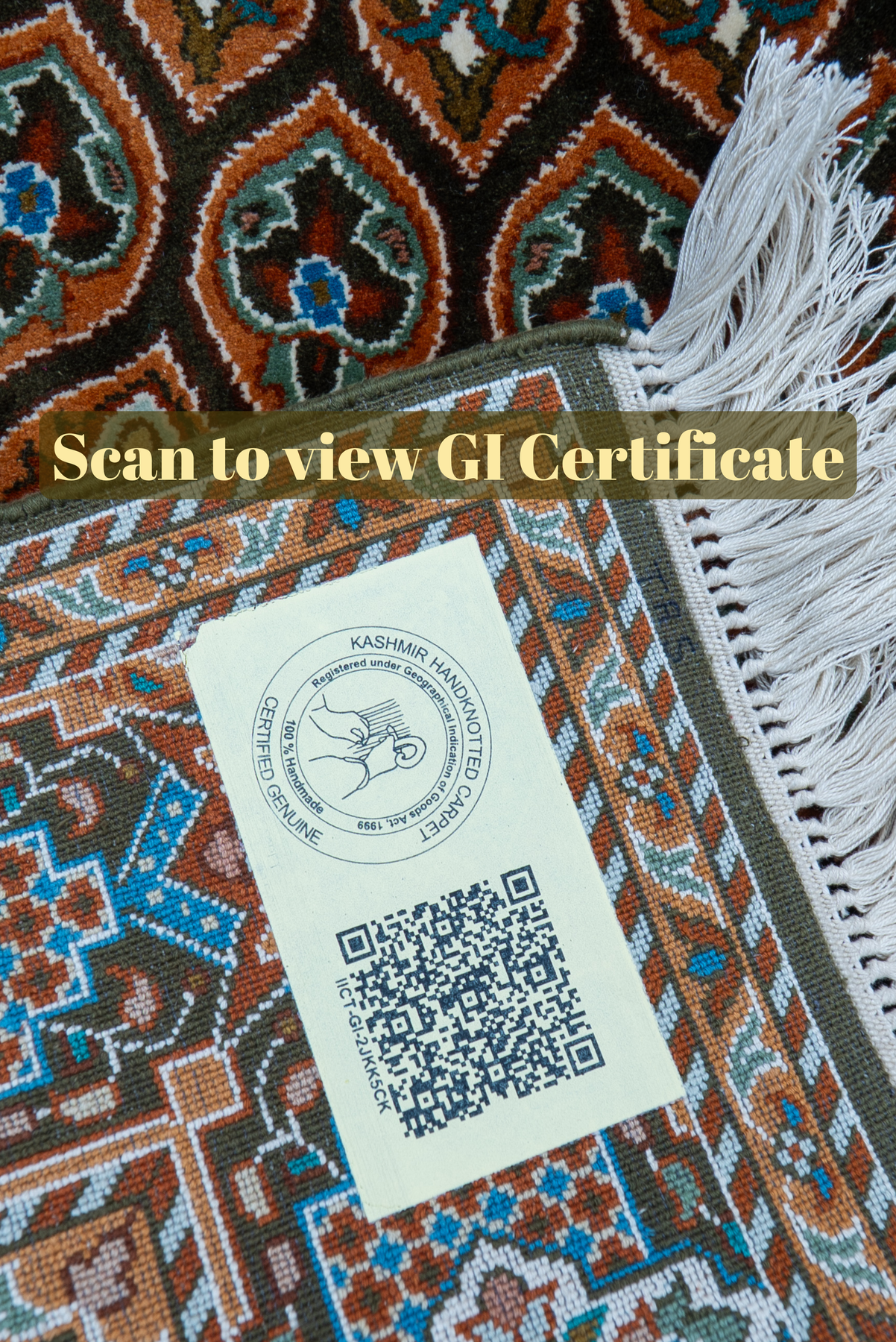 To guarantee authenticity, every Pure silk on silk carpet is accompanied by a Geographical Indication (GI) Certificate, issued by the Government of India. This certificate confirms that this carpet is a 100% Pure silk carpet and is Hand-knotted, and Hand-Crafted by local Artisans in Kashmir valley.