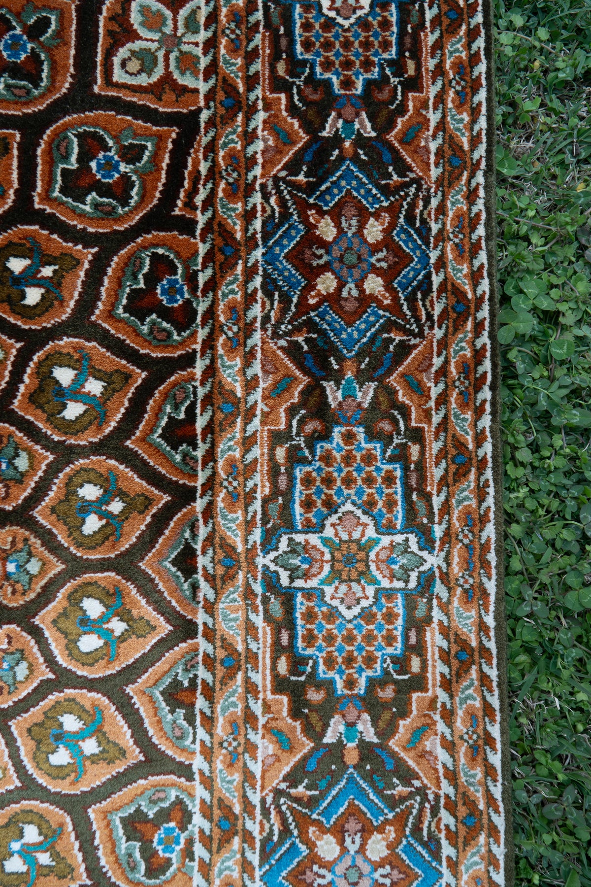 A captivating blend of earthy browns and cool azure tones, this carpet features a beautifully structured mosaic pattern radiating from a central medallion. The repeating motifs create a sense of rhythm and depth, giving the design a dynamic yet harmonious presence.