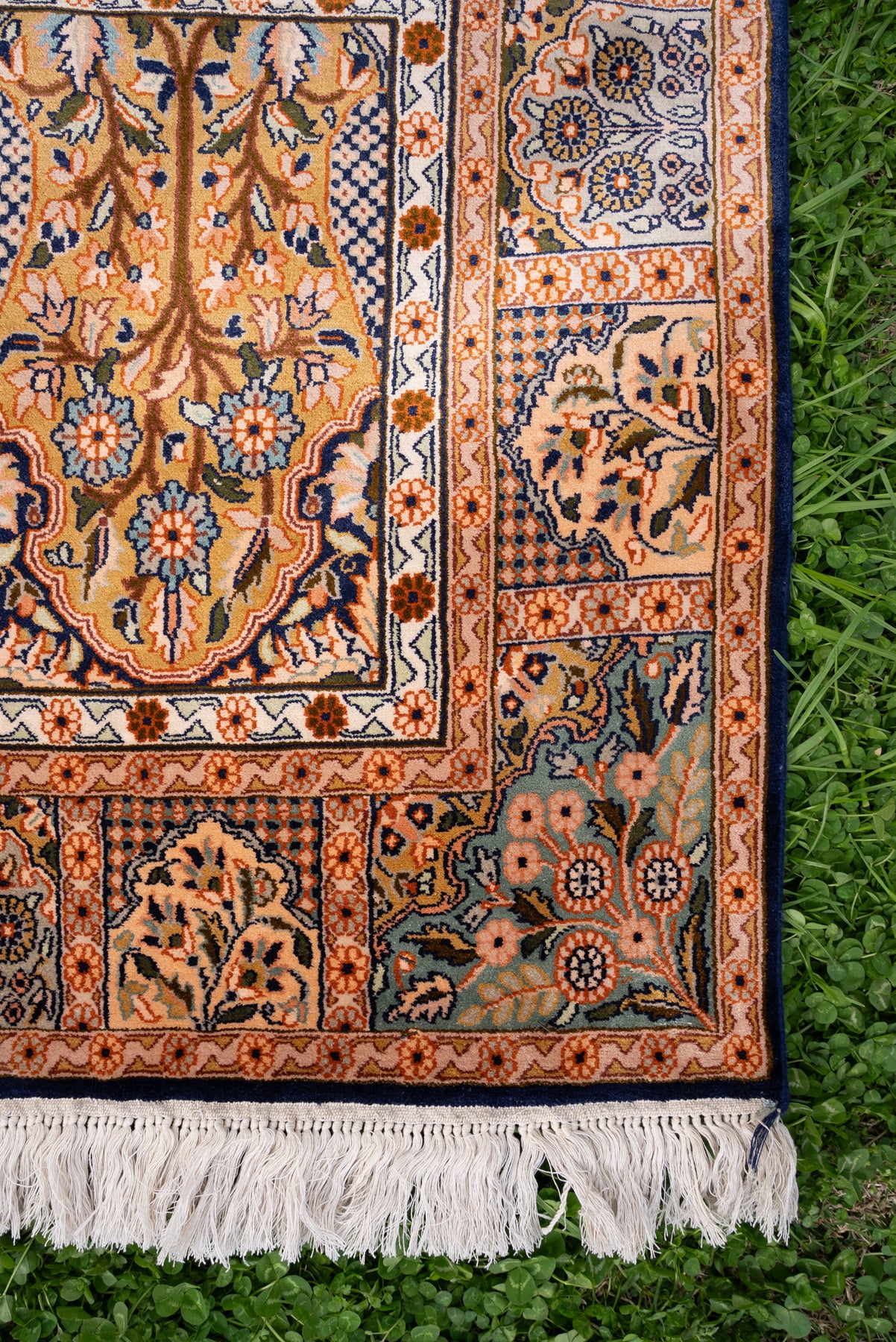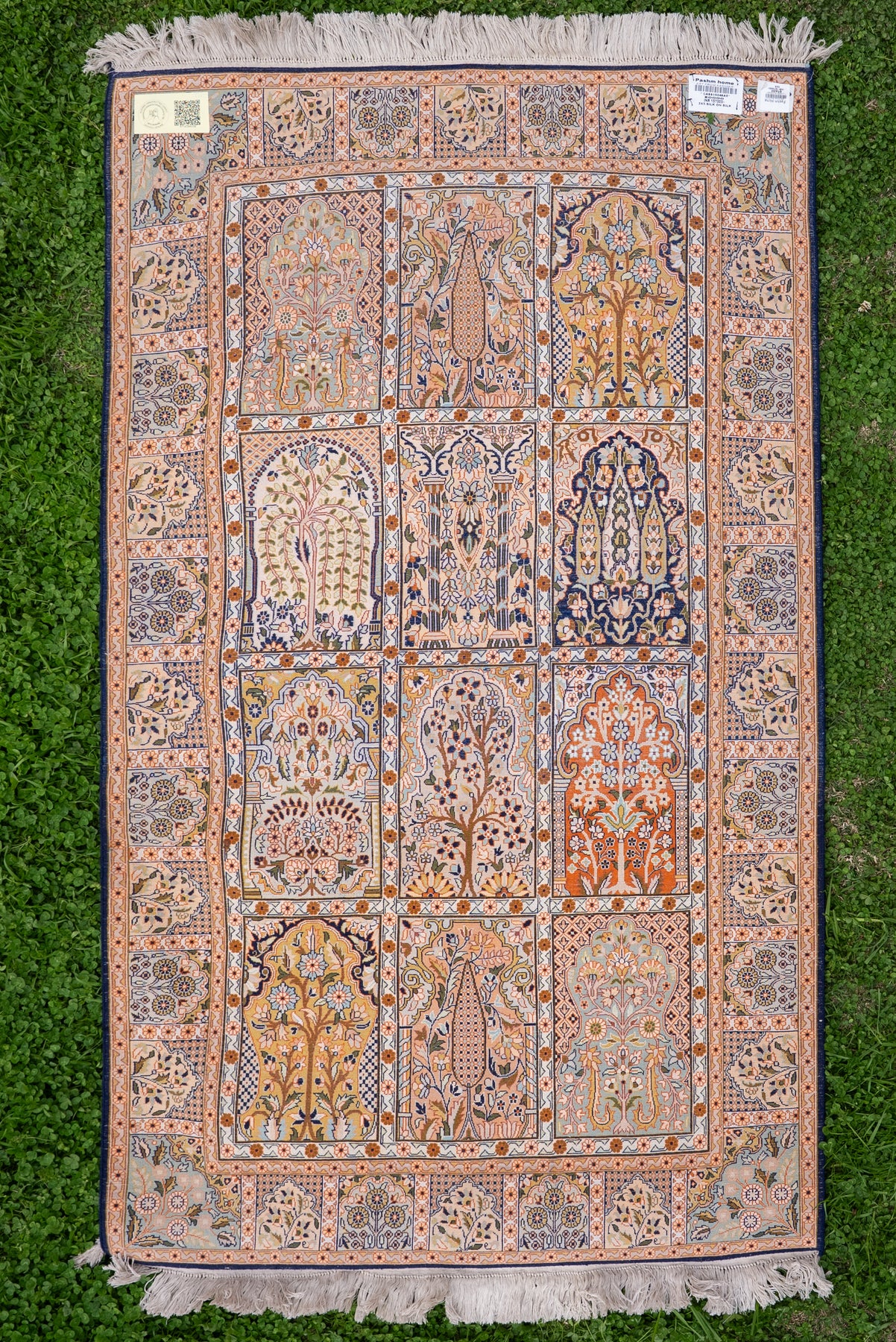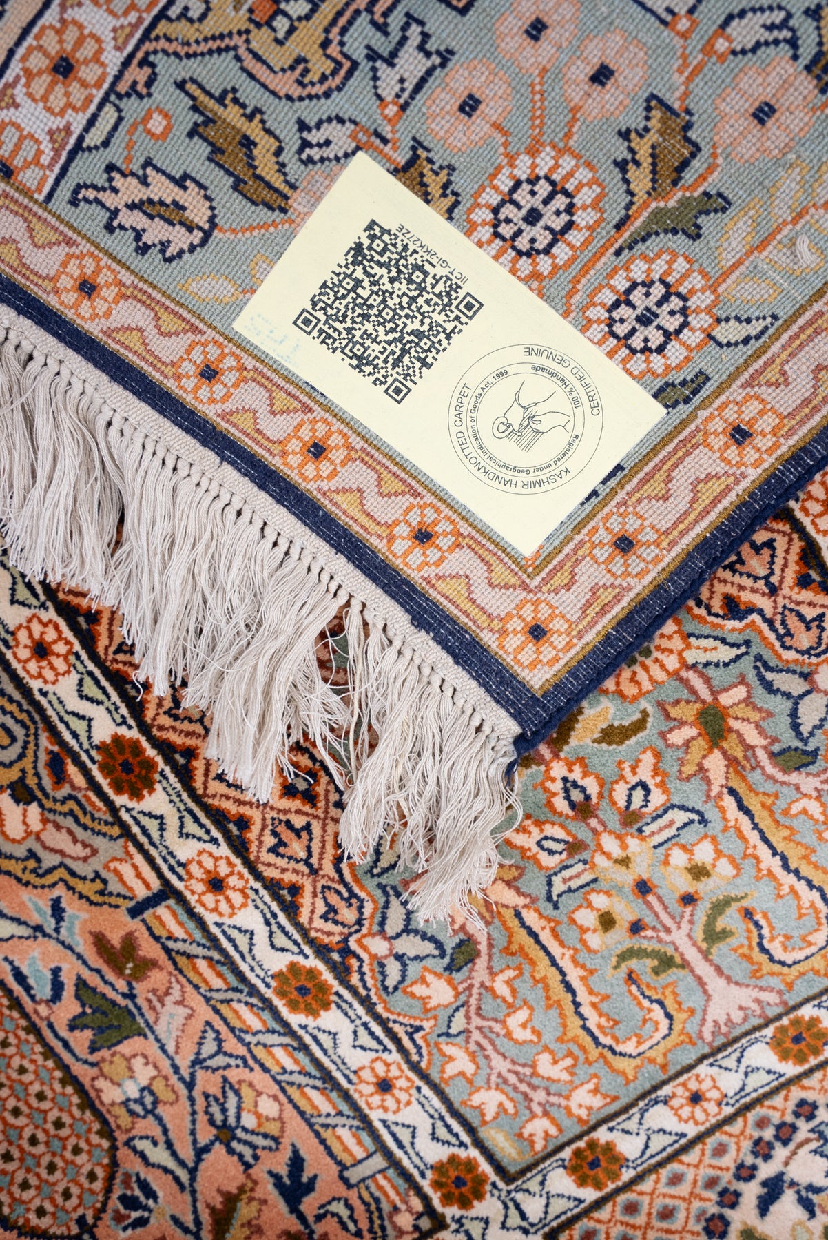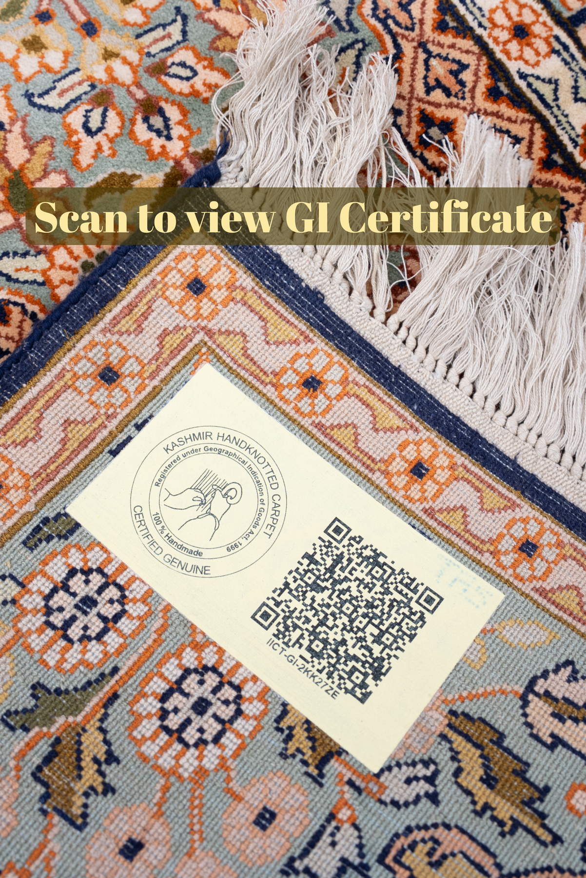To guarantee authenticity, every Pure silk on silk carpet is accompanied by a Geographical Indication (GI) Certificate, issued by the Government of India. This certificate confirms that this carpet is a 100% Pure silk carpet and is Hand-knotted, and Hand-Crafted by local Artisans in Kashmir valley.