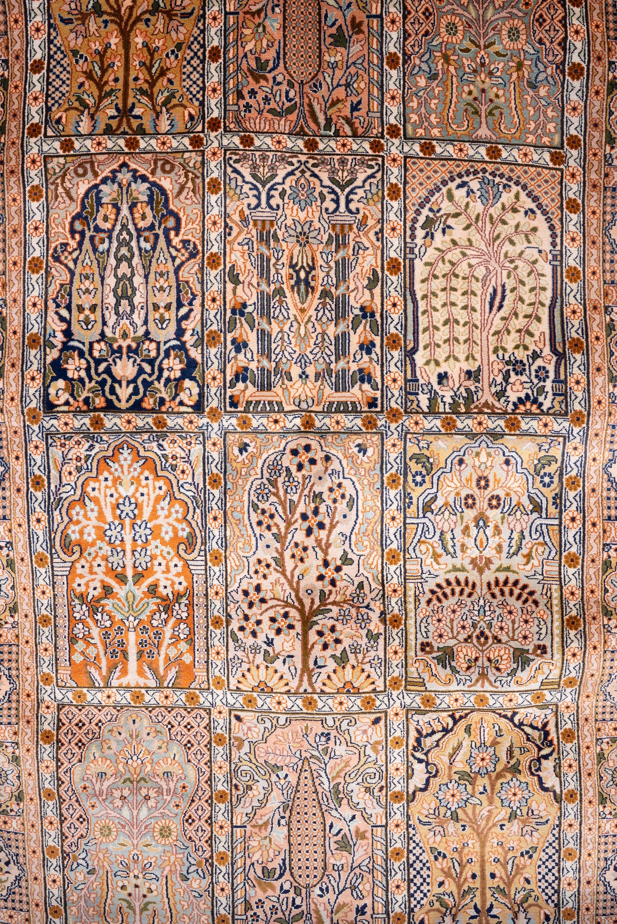 Featuring a series of ornate panels filled with floral and tree-inspired motifs, this carpet reflects the beauty of a structured garden layout. The soft earthy tones and detailed borders add to its classic charm.