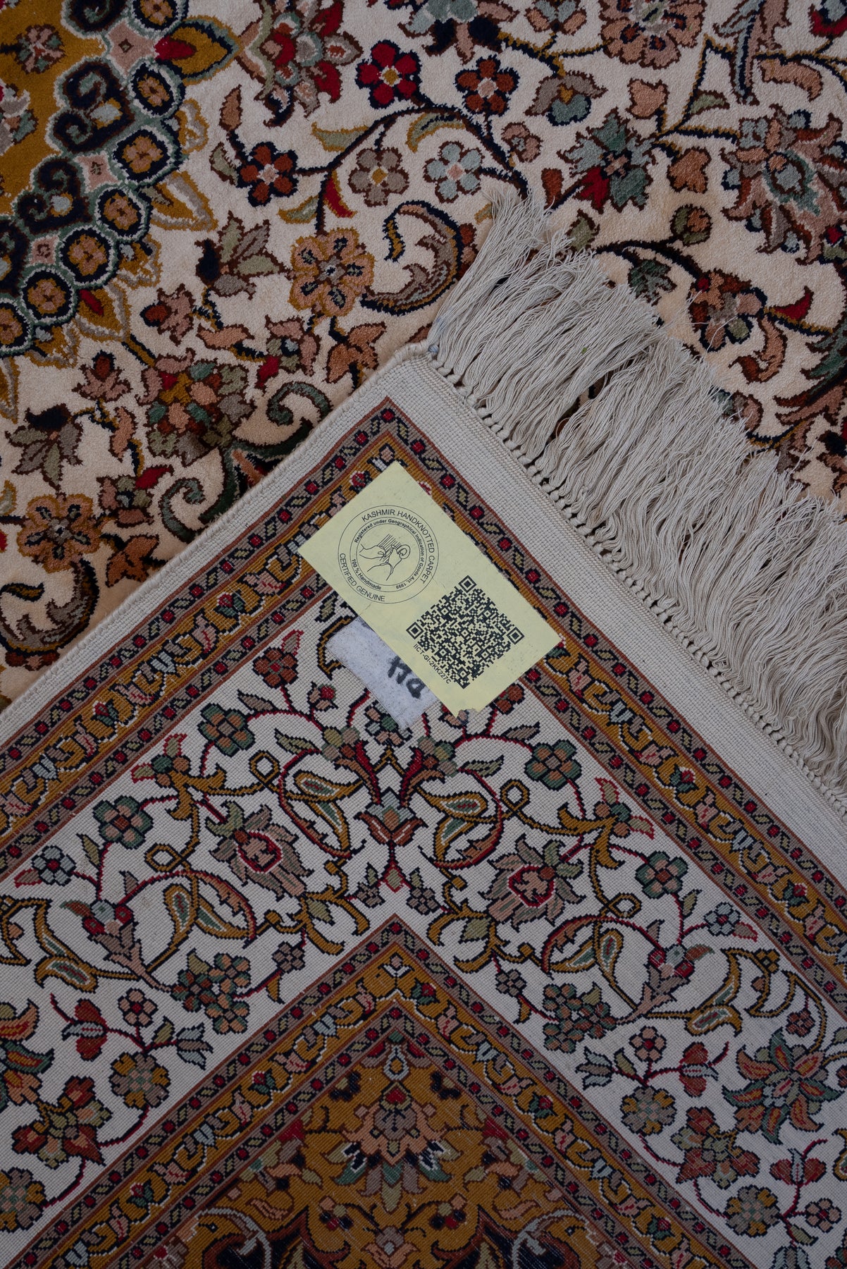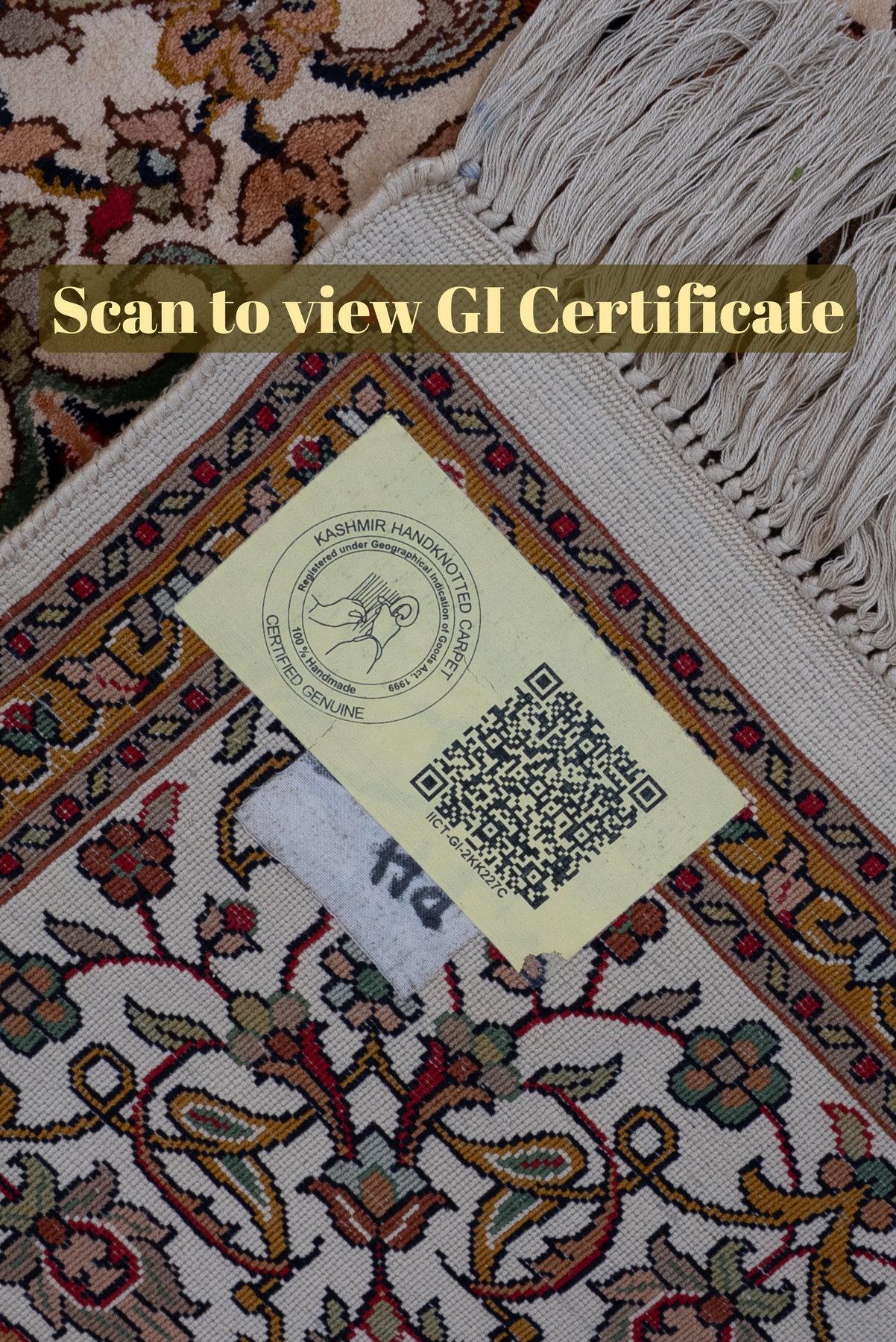 To guarantee authenticity, every Pure silk on silk carpet is accompanied by a Geographical Indication (GI) Certificate, issued by the Government of India. This certificate confirms that this carpet is a 100% Pure silk carpet and is Hand-knotted, and Hand-Crafted by local Artisans in Kashmir valley.