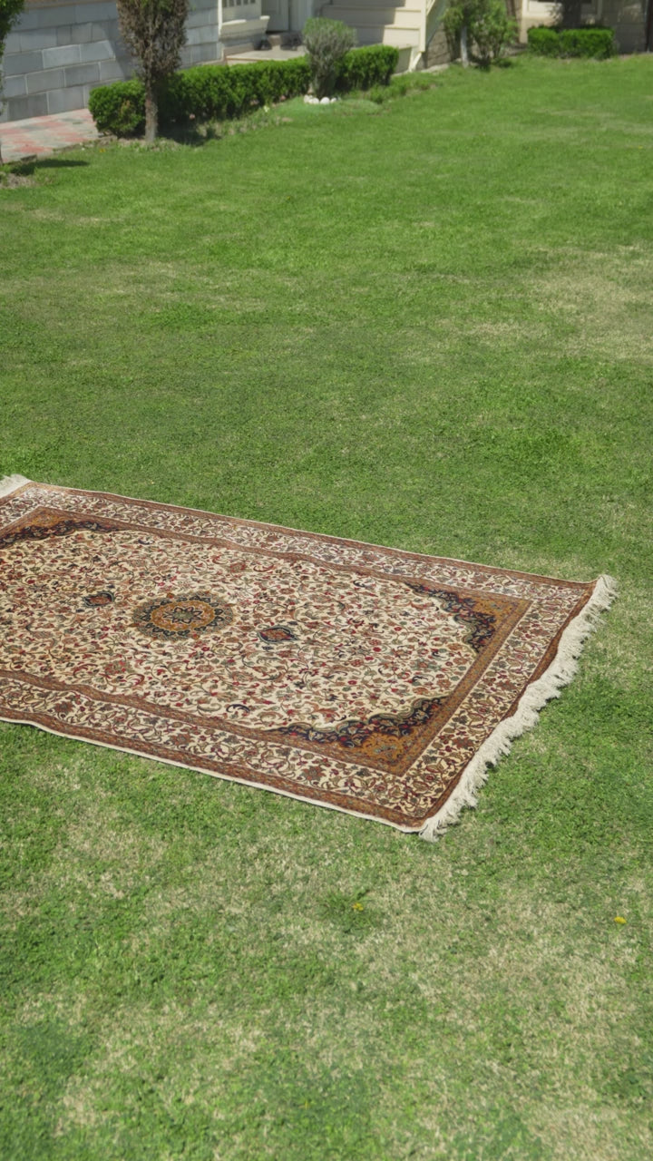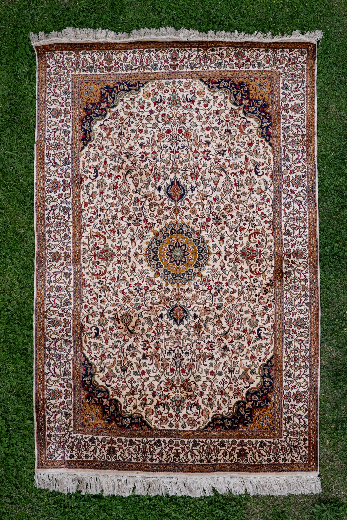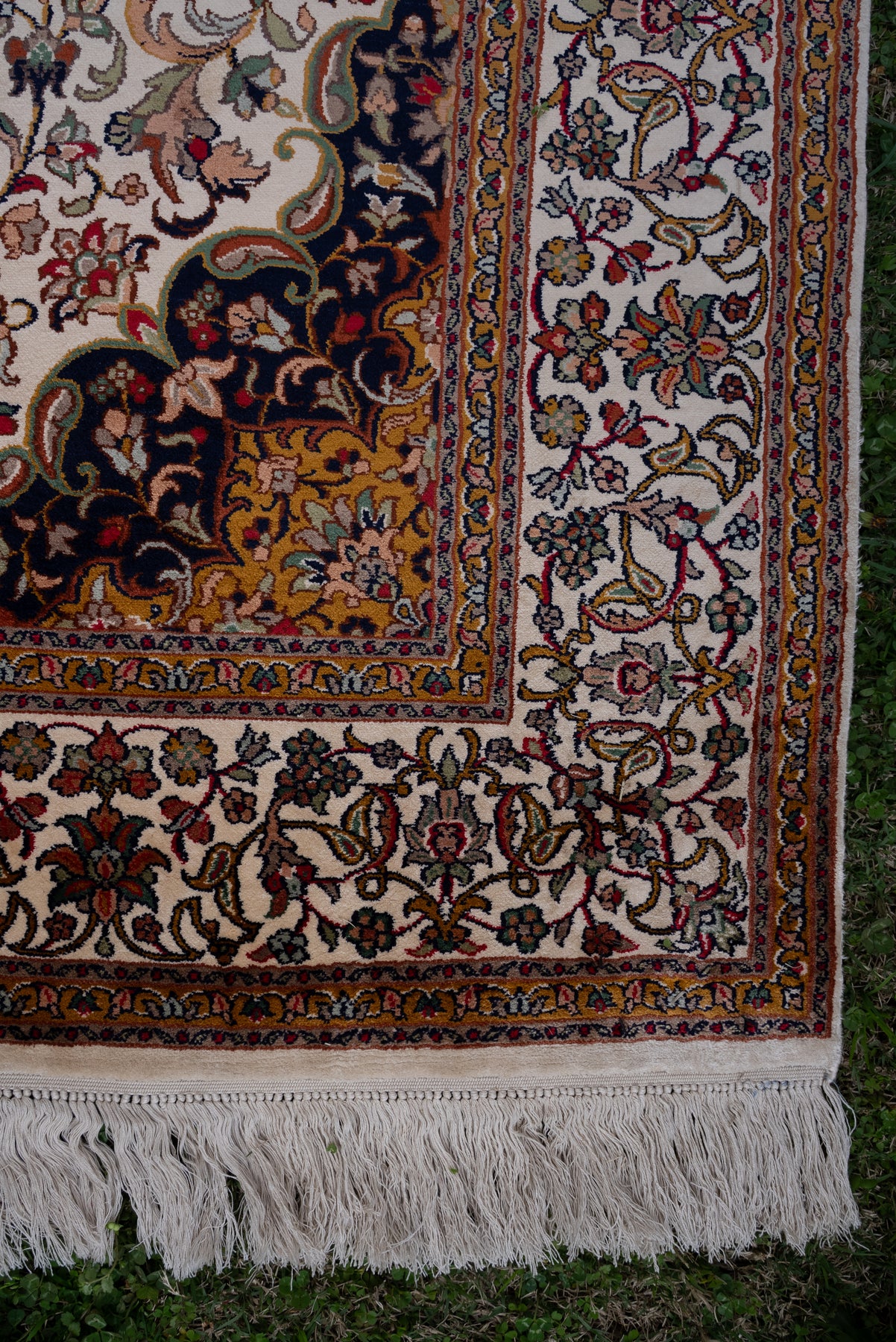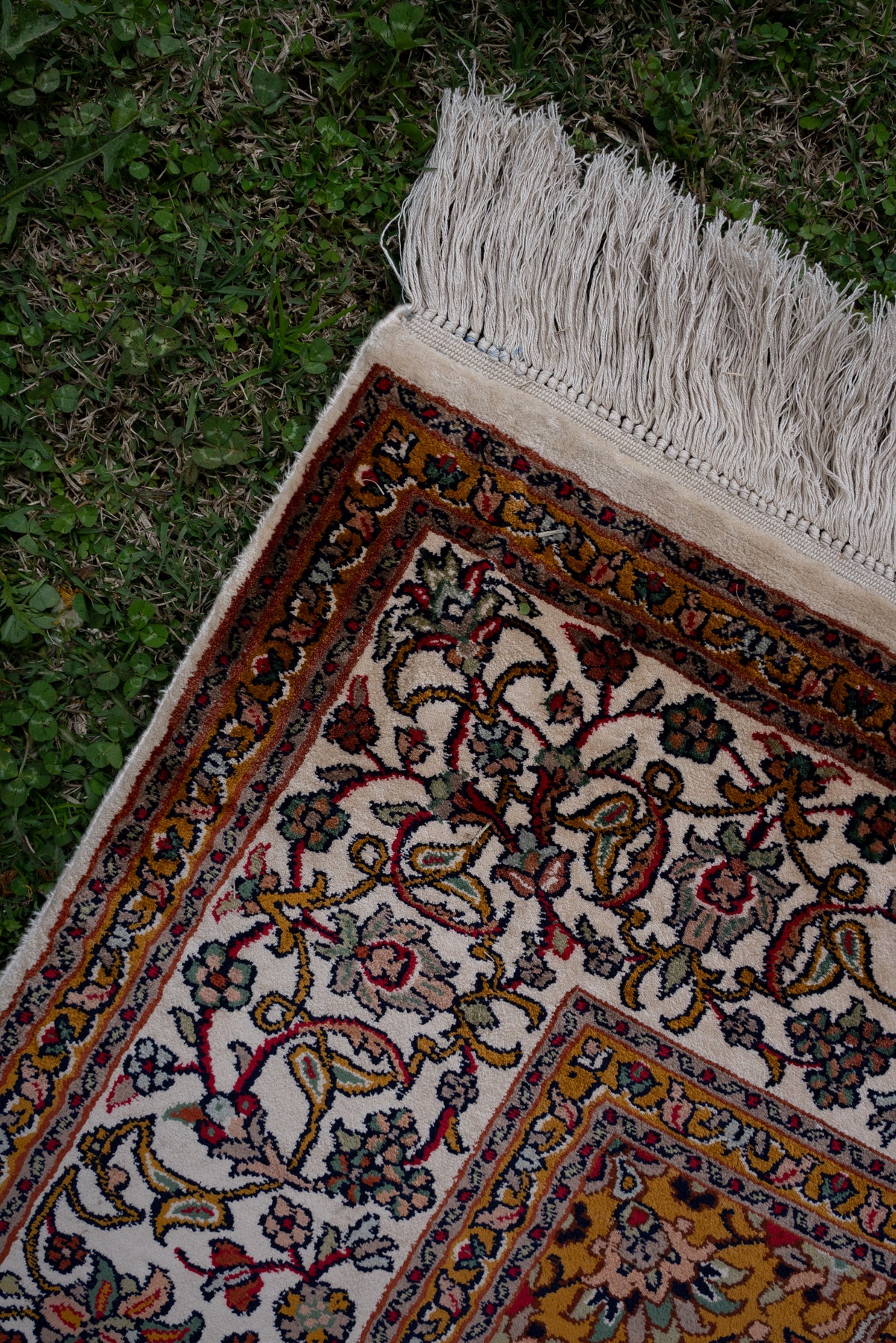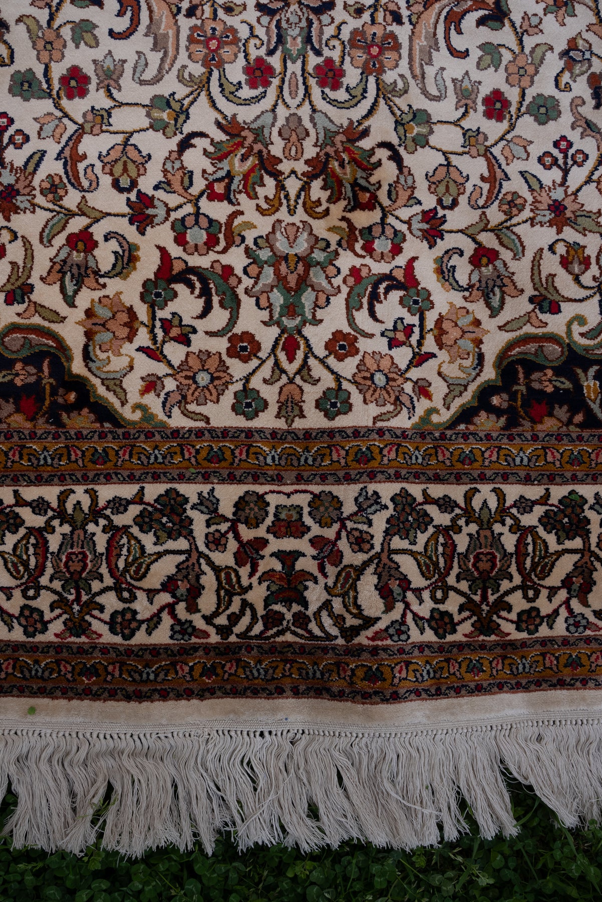 7ft x 5ft: Ivory Blossom Symphony: Hand Knotted Mulberry silk on silk Kashmiri Carpet