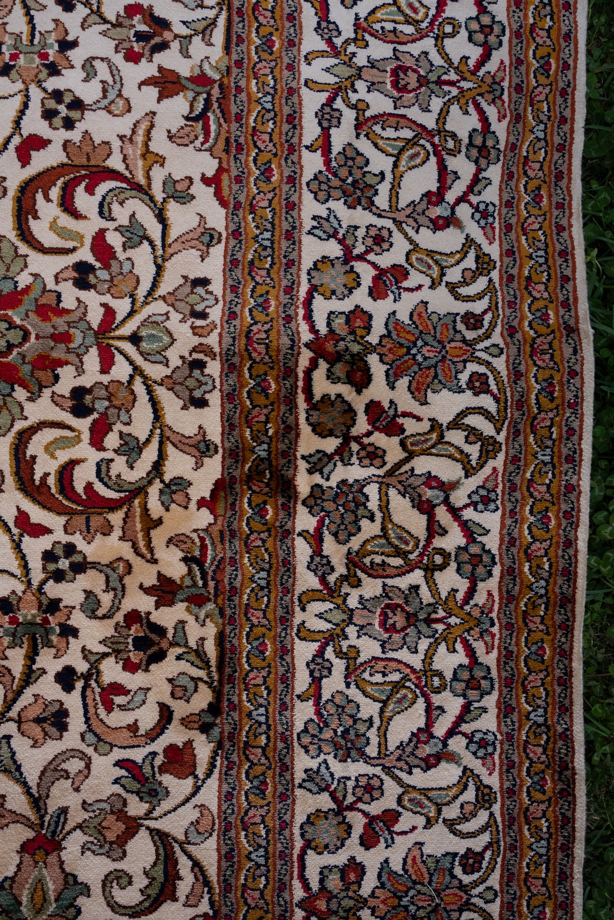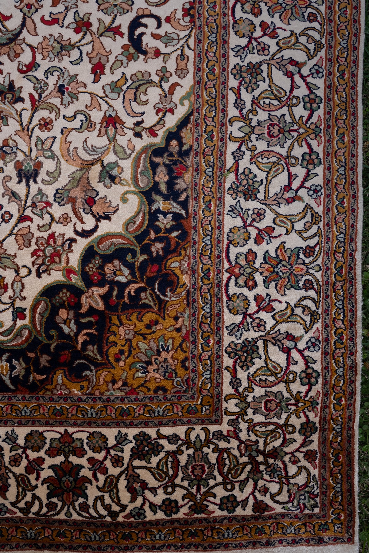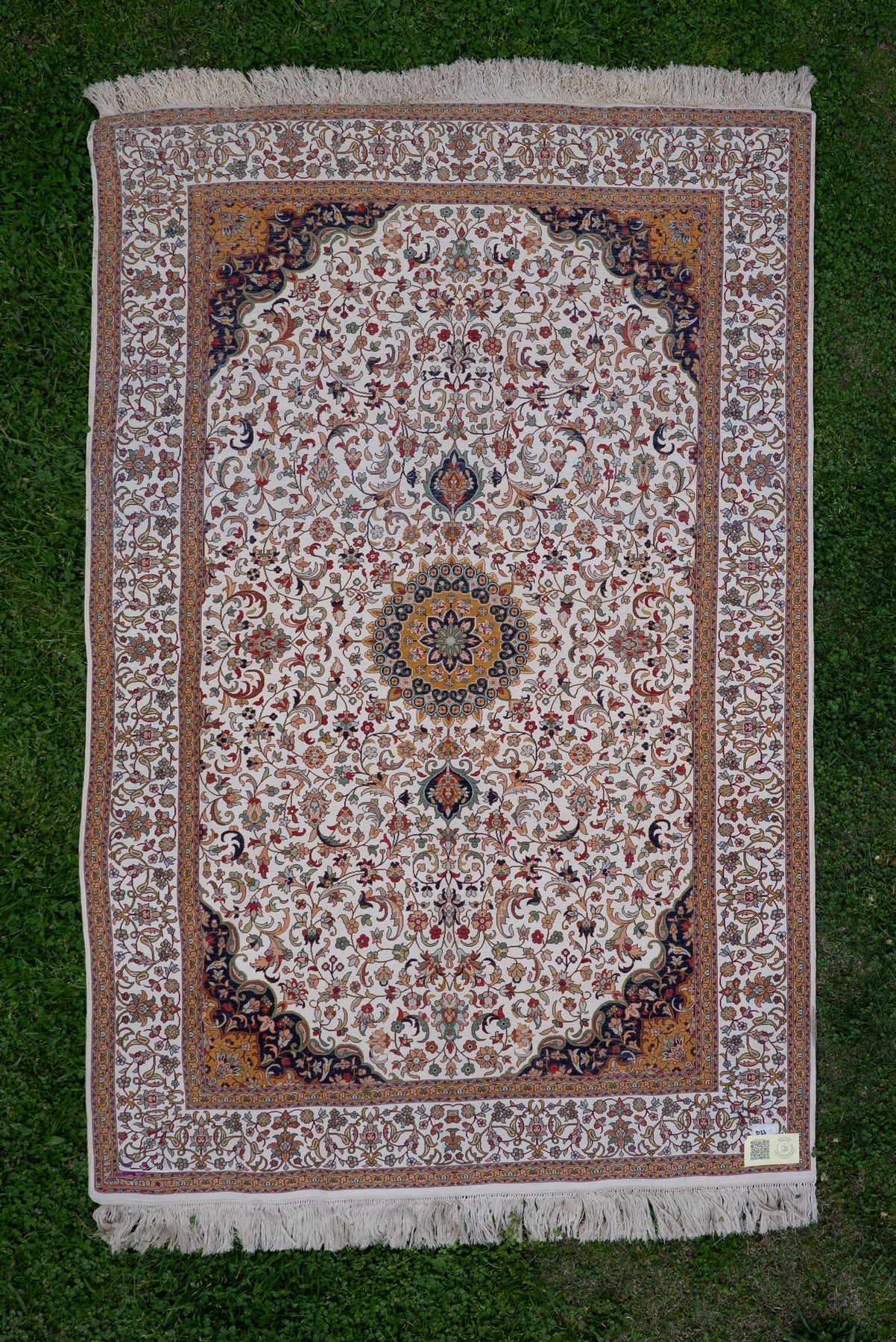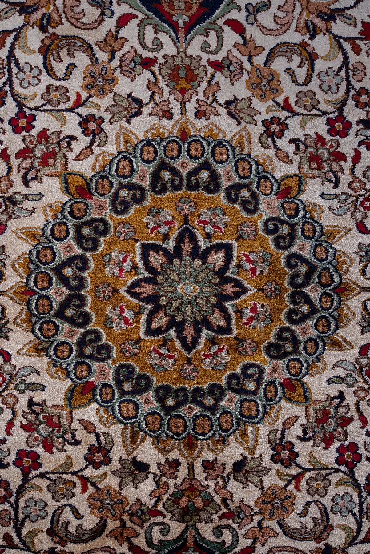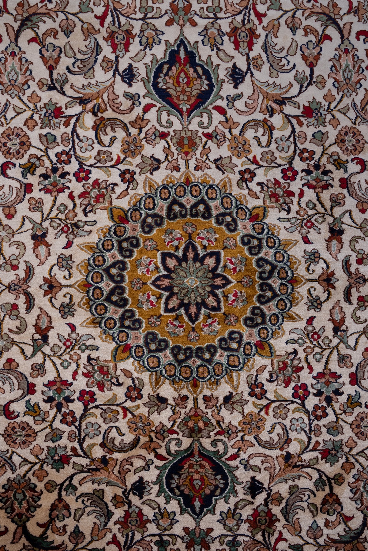 7ft x 5ft: Ivory Blossom Symphony: Hand Knotted Mulberry silk on silk Kashmiri Carpet