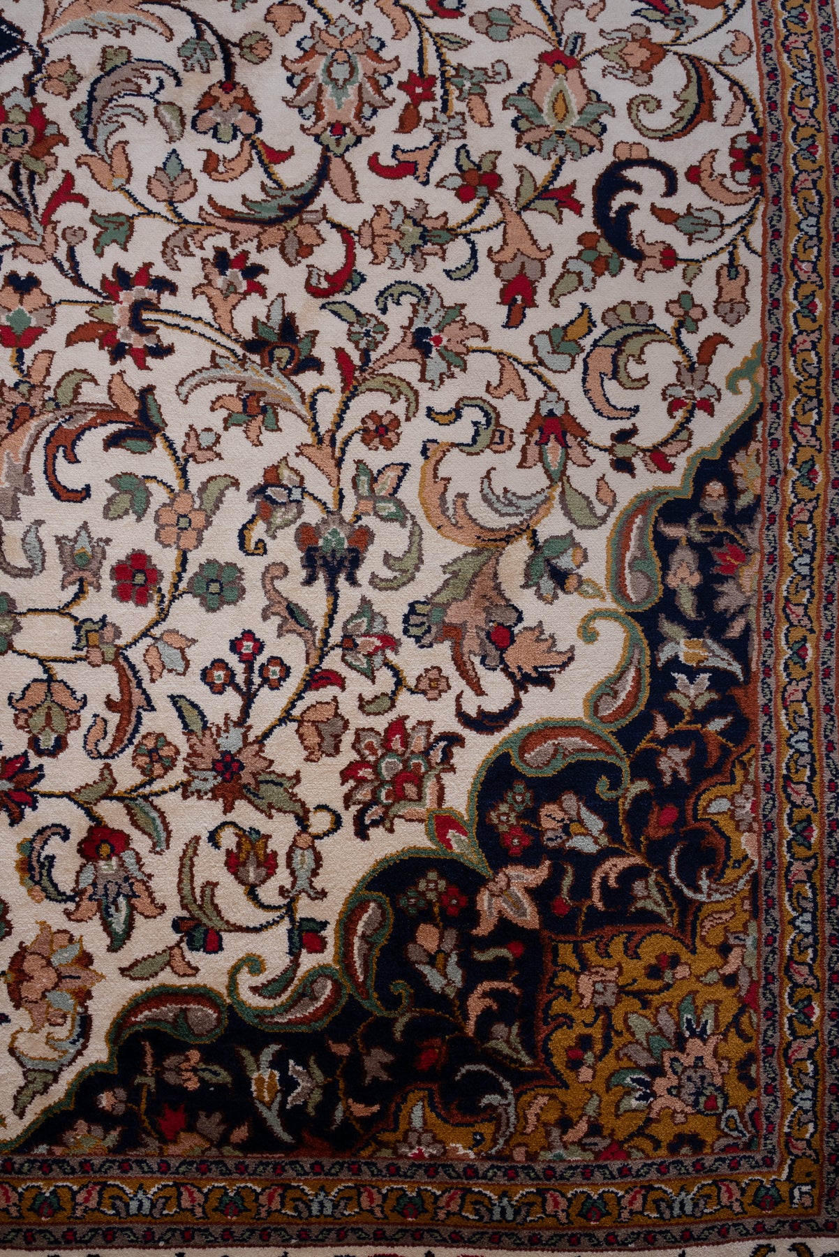 Set against a soft ivory backdrop, this carpet blooms with an intricate symphony of floral vines and delicate motifs. The central medallion anchors the design while the surrounding patterns create a sense of movement, reminiscent of a finely painted masterpiece.