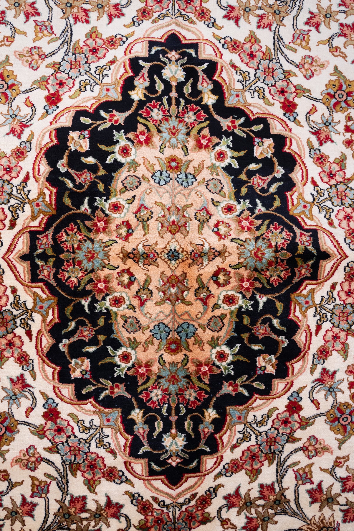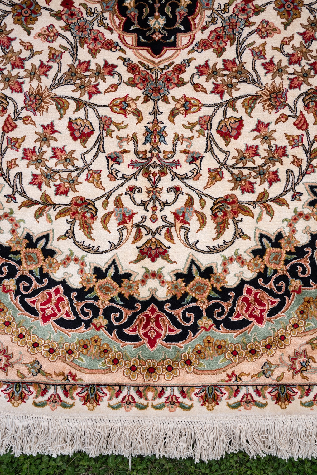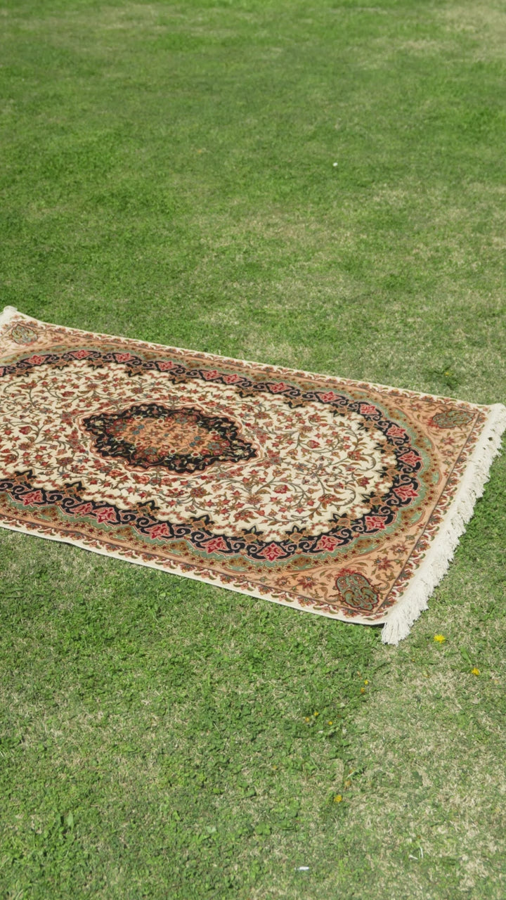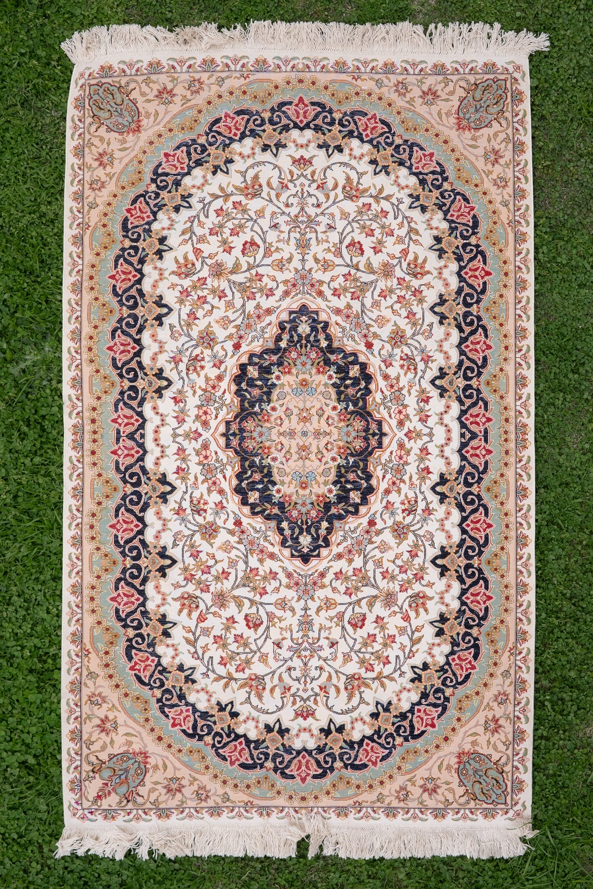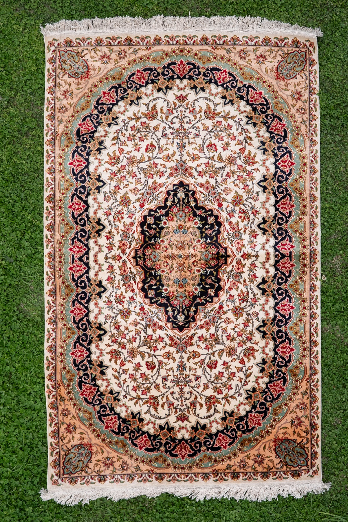 2.5ft x 4ft Ivory Royal Bloom: Hand Knotted Mulberry silk on silk Kashmiri Carpet