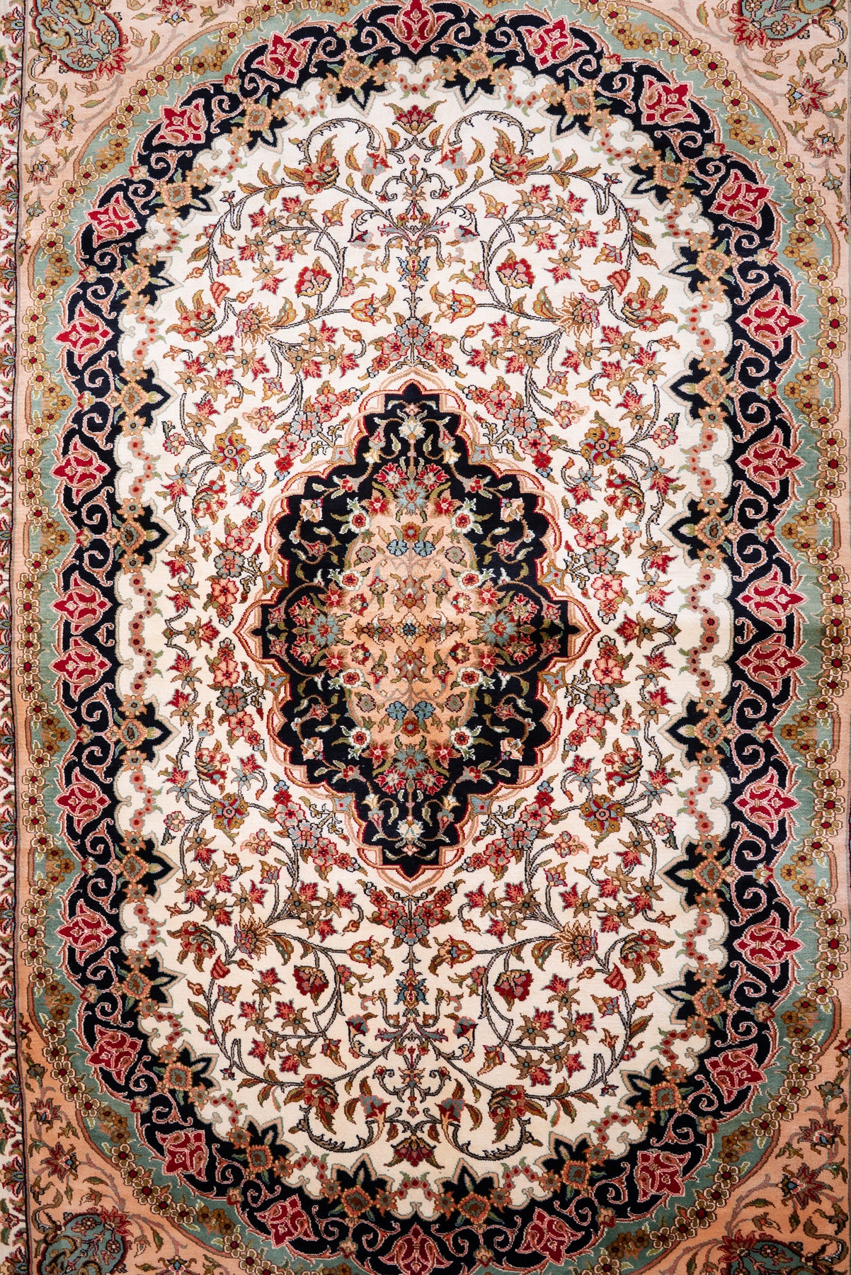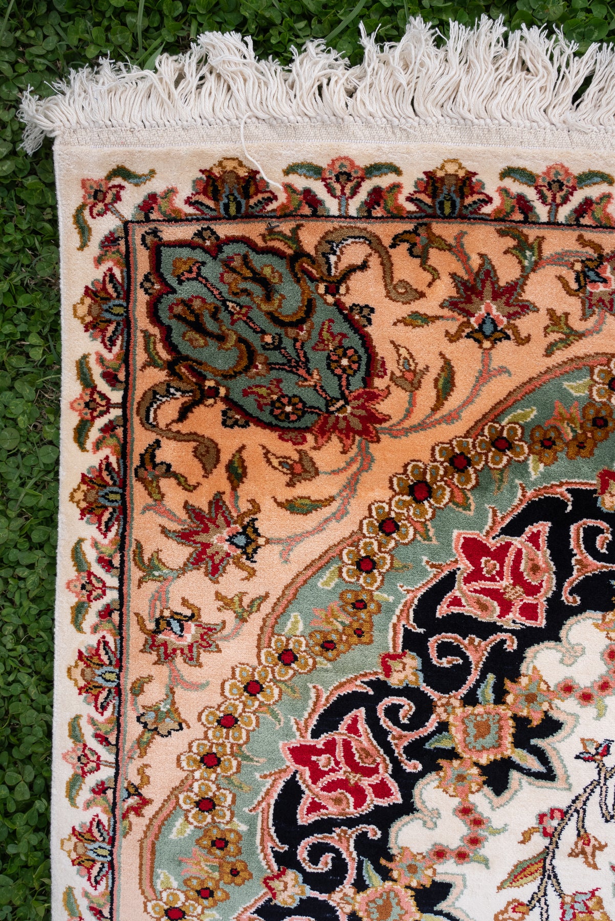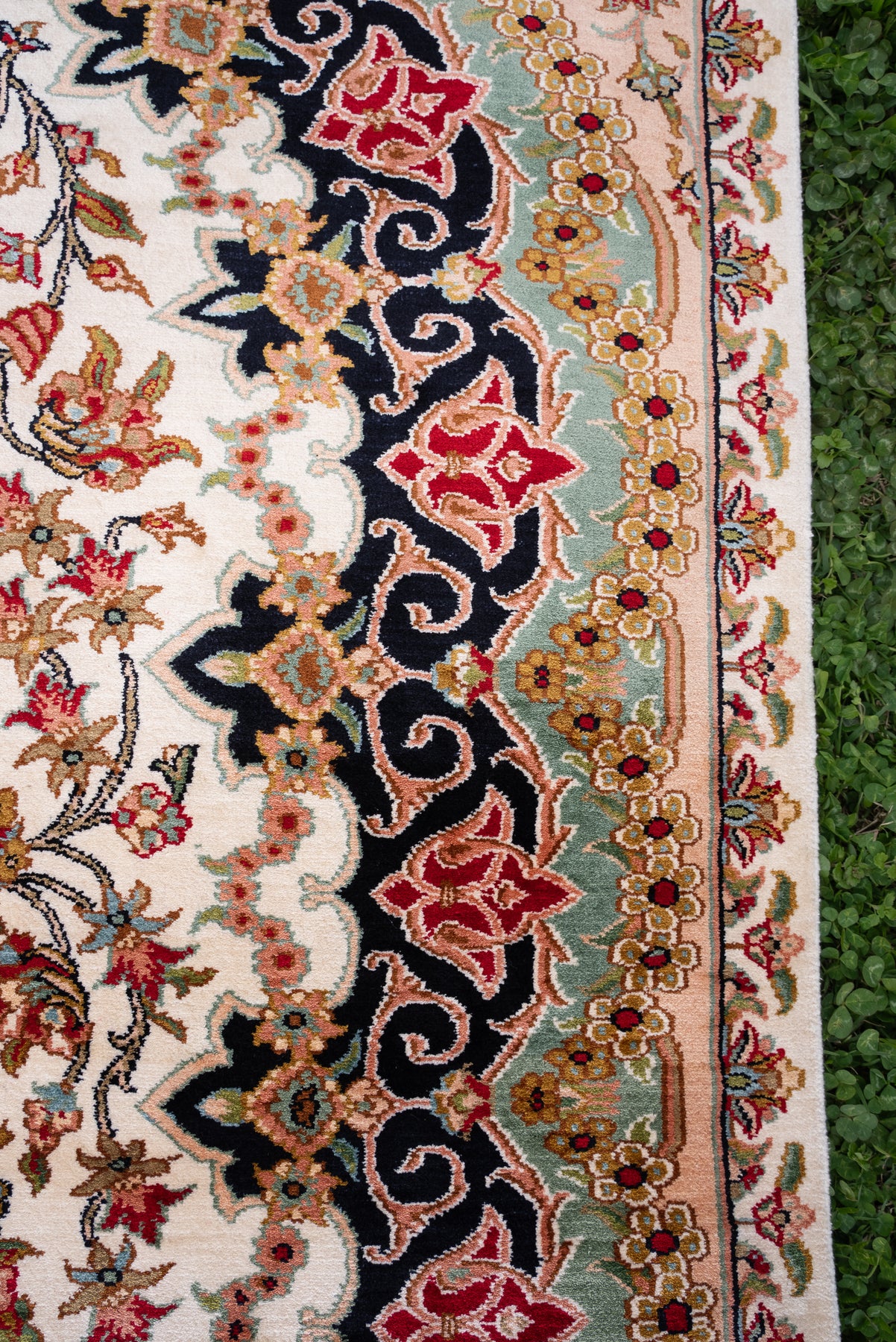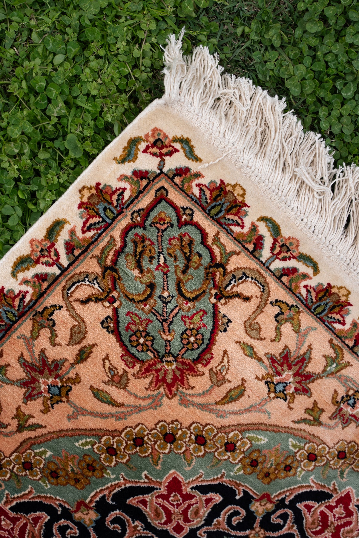 Hand knotted using mulberry silk on silk, the piece carries a subtle sheen that highlights its detailed craftsmanship. Its balanced composition and gentle palette make it a timeless addition to any refined setting.