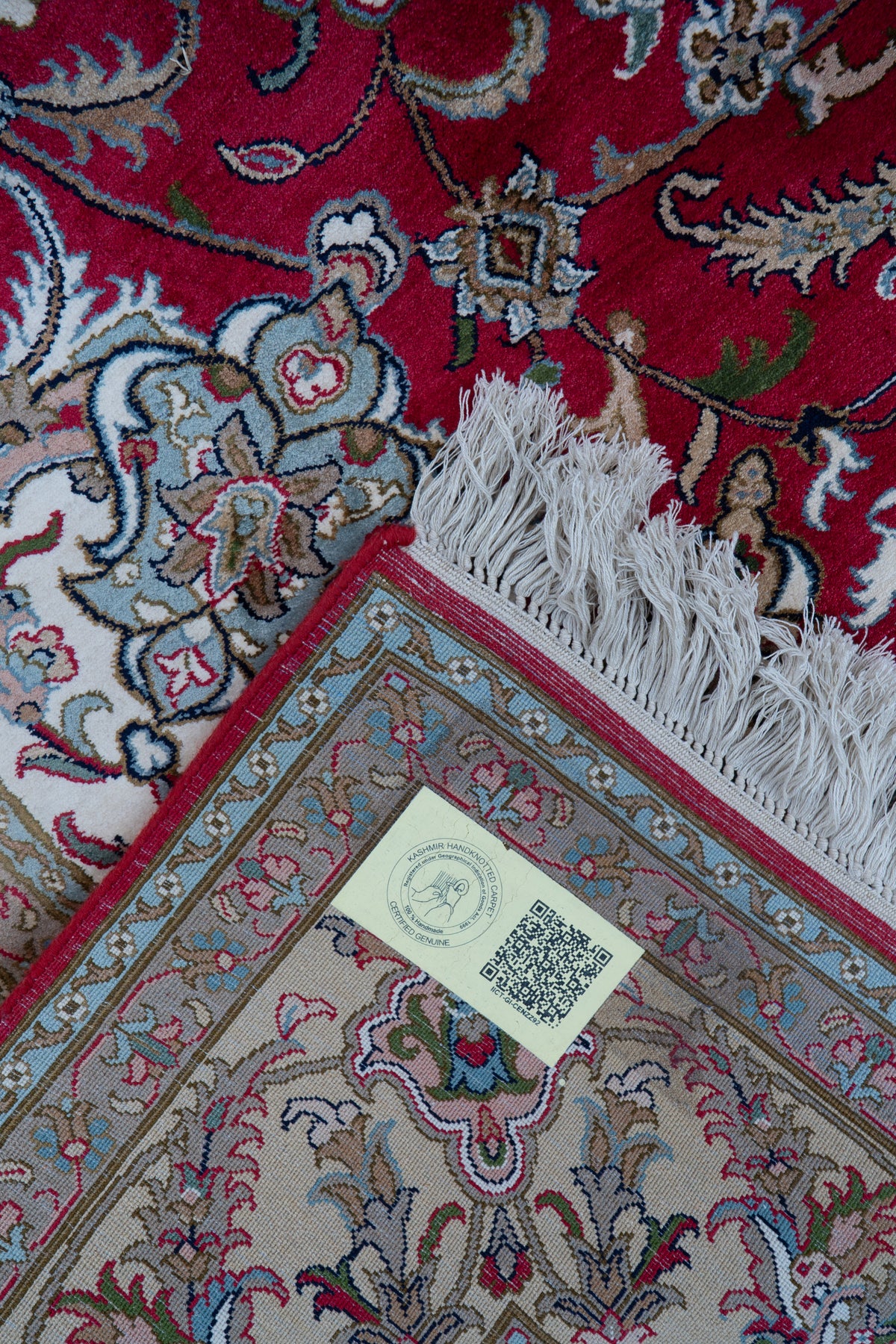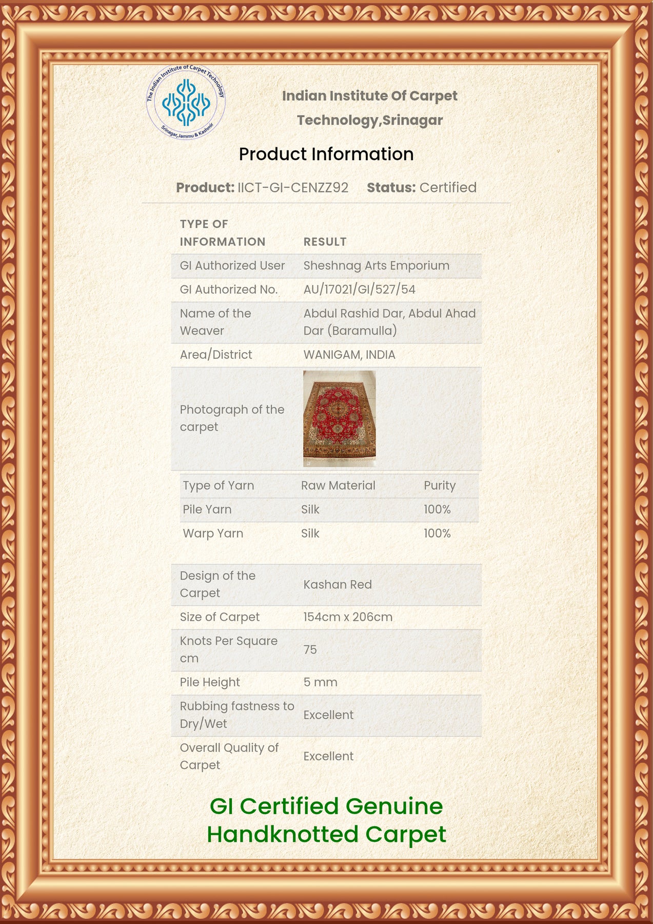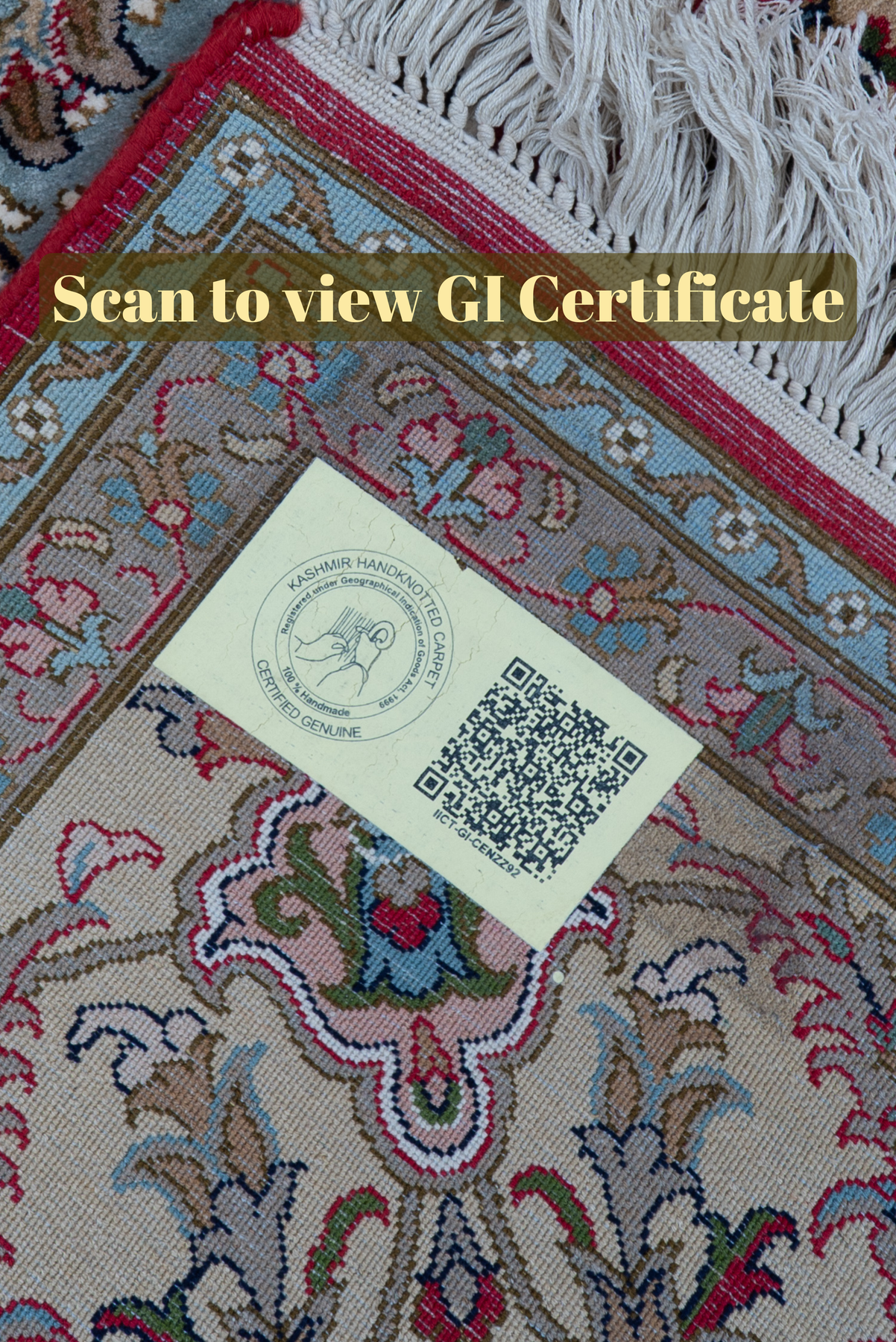 To guarantee authenticity, every Pure silk on silk carpet is accompanied by a Geographical Indication (GI) Certificate, issued by the Government of India. This certificate confirms that this carpet is a 100% Pure silk carpet and is Hand-knotted, and Hand-Crafted by local Artisans in Kashmir valley.