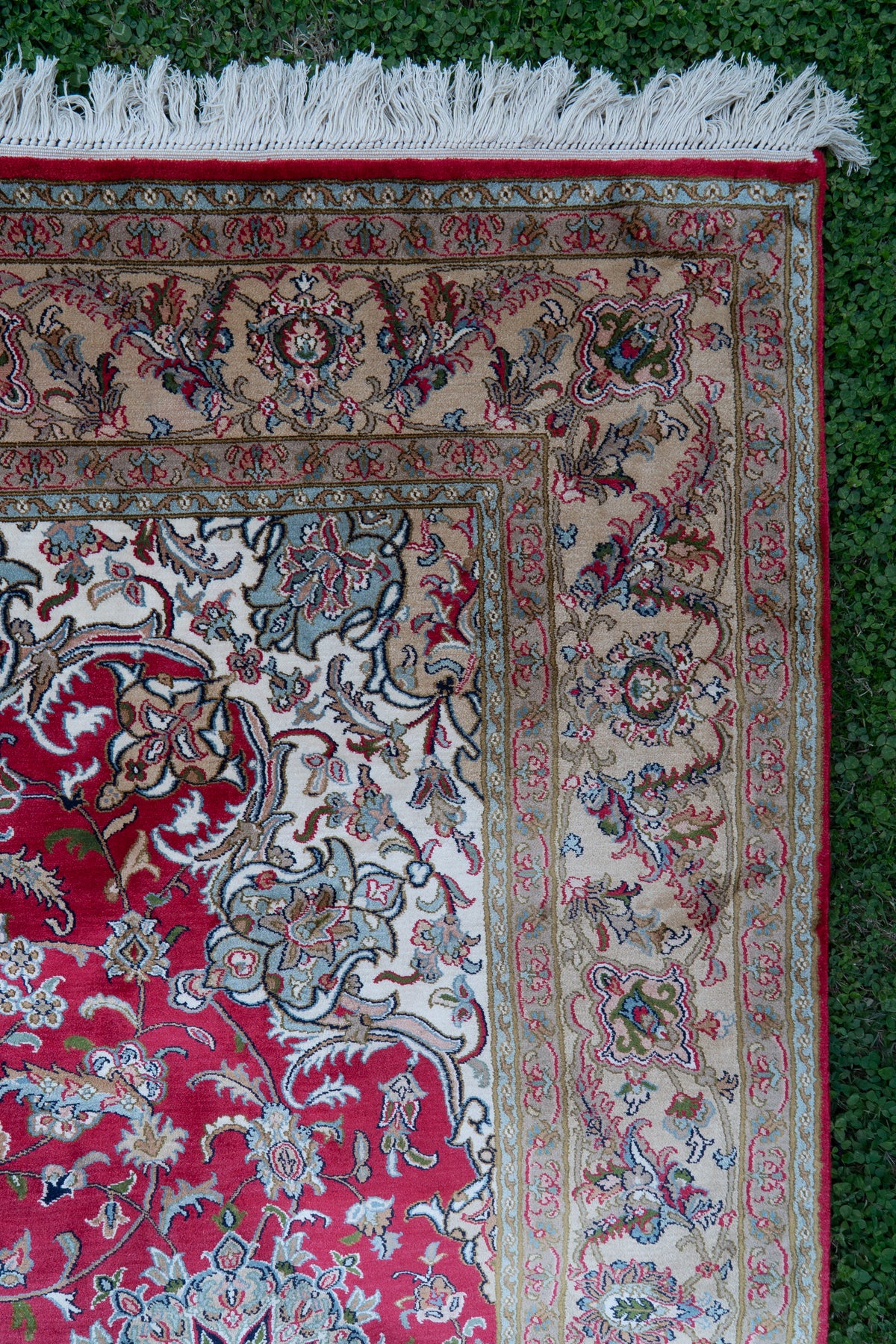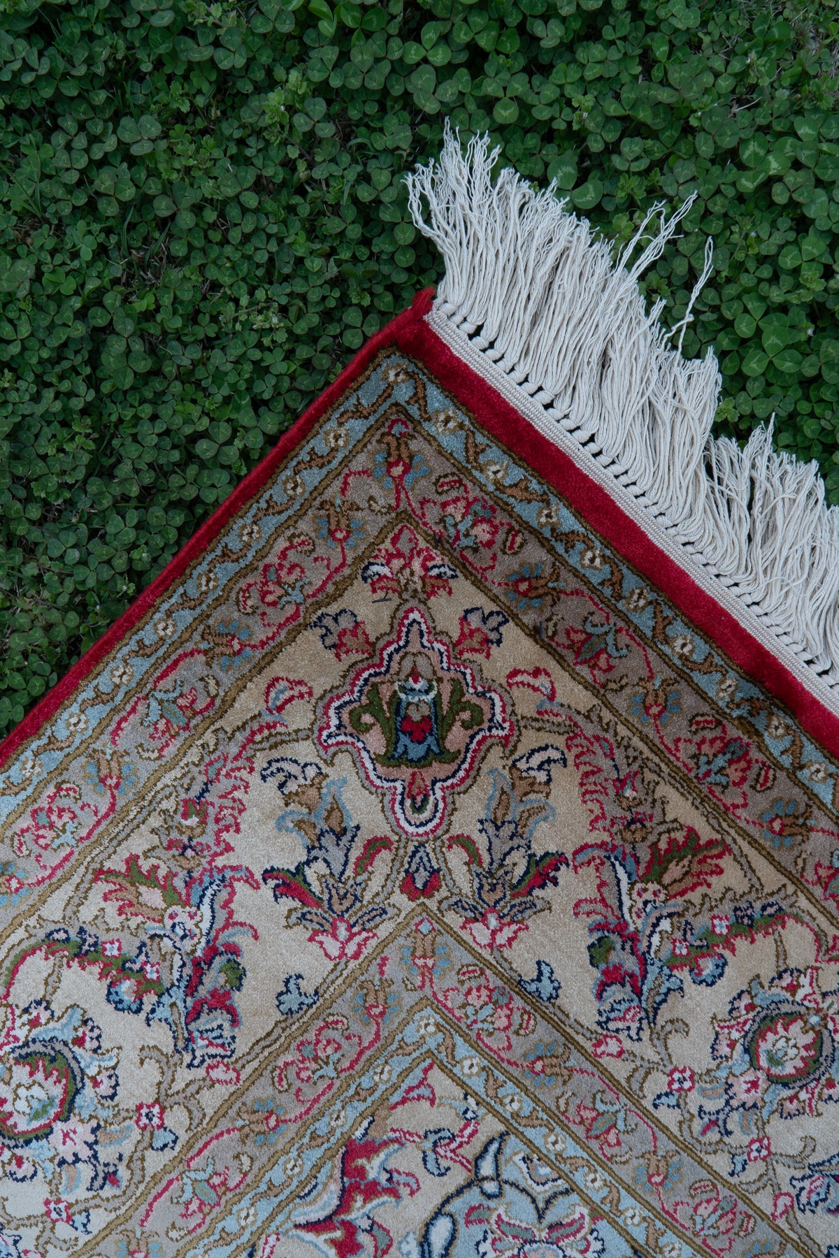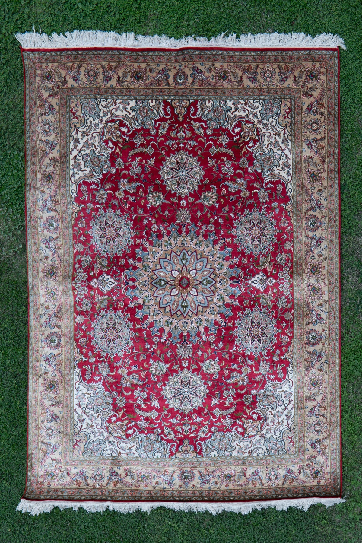 7ft x 5ft: Regal Crimson Medallion Garden: Hand Knotted Mulberry silk on silk Kashmiri Carpet