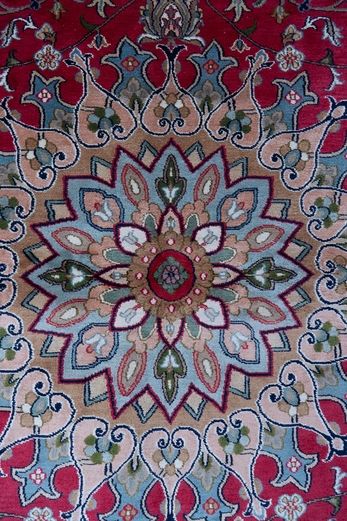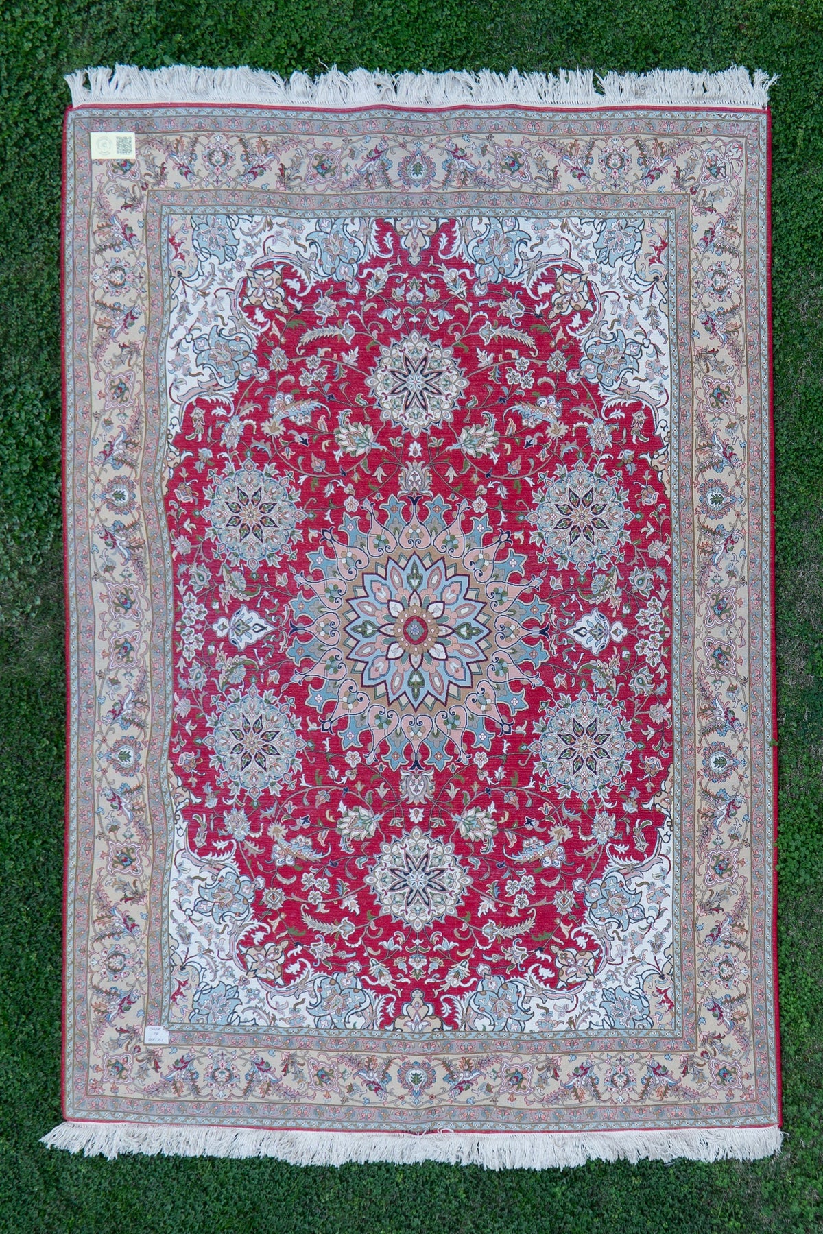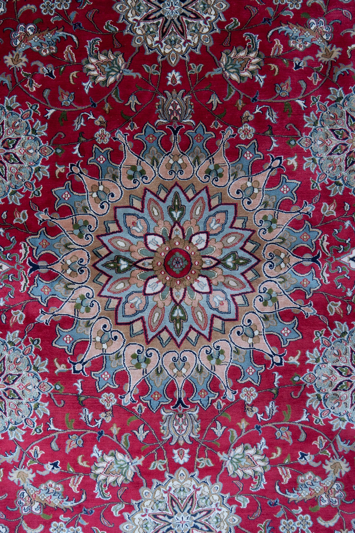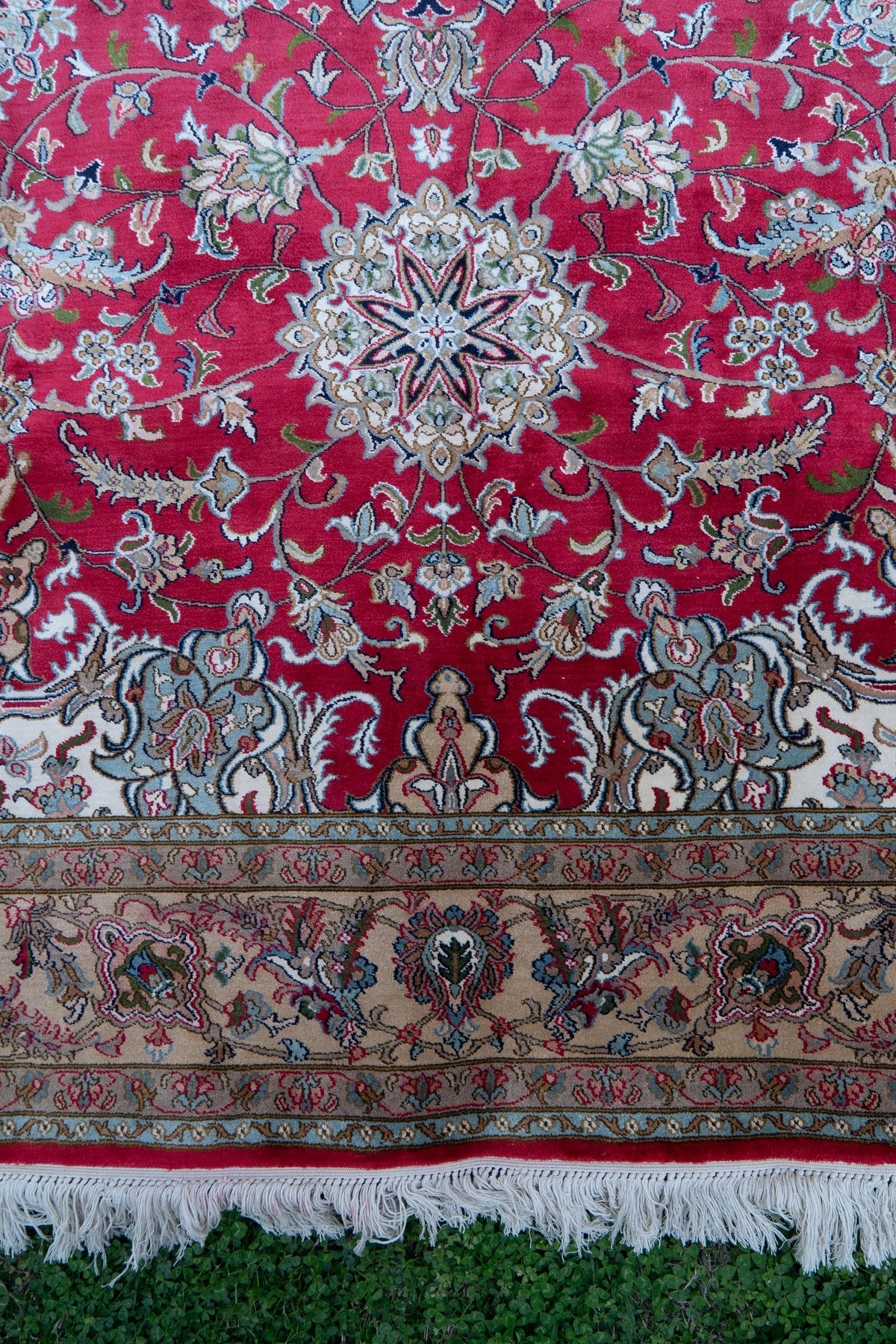7ft x 5ft: Regal Crimson Medallion Garden: Hand Knotted Mulberry silk on silk Kashmiri Carpet