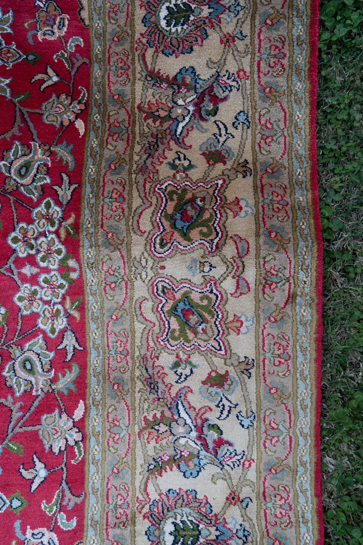 This luxurious piece is defined by its bold crimson field, richly adorned with delicate floral vines and a striking central medallion. The surrounding ivory-toned borders soften the composition, creating a perfect balance between intensity and elegance.