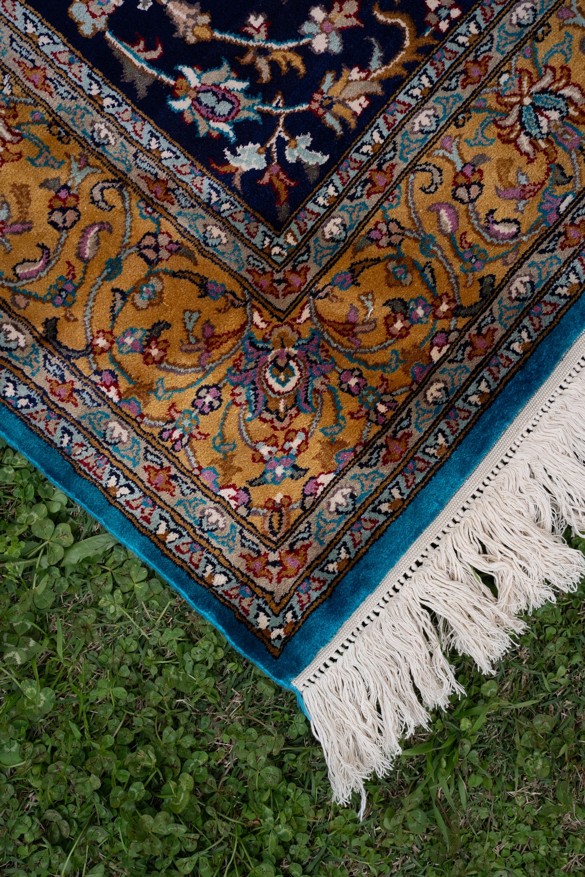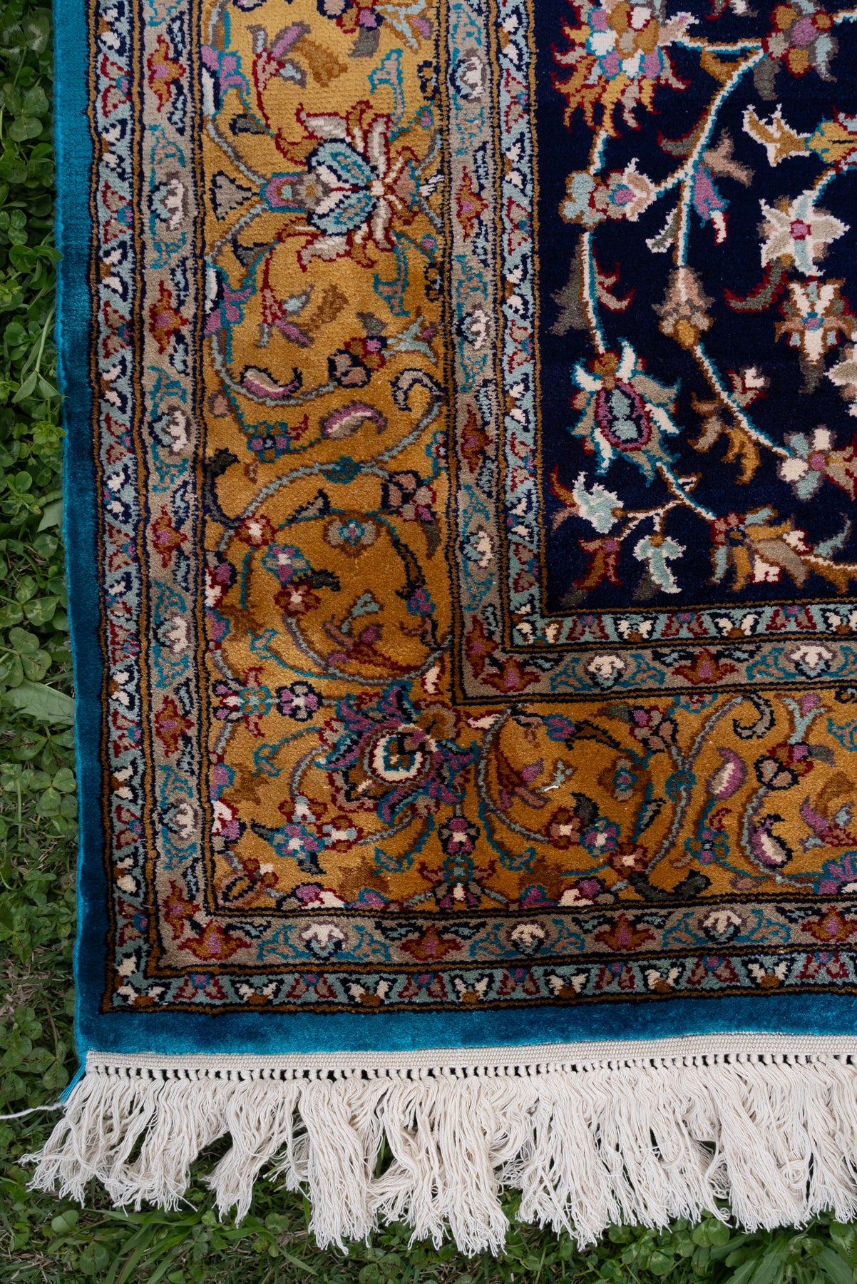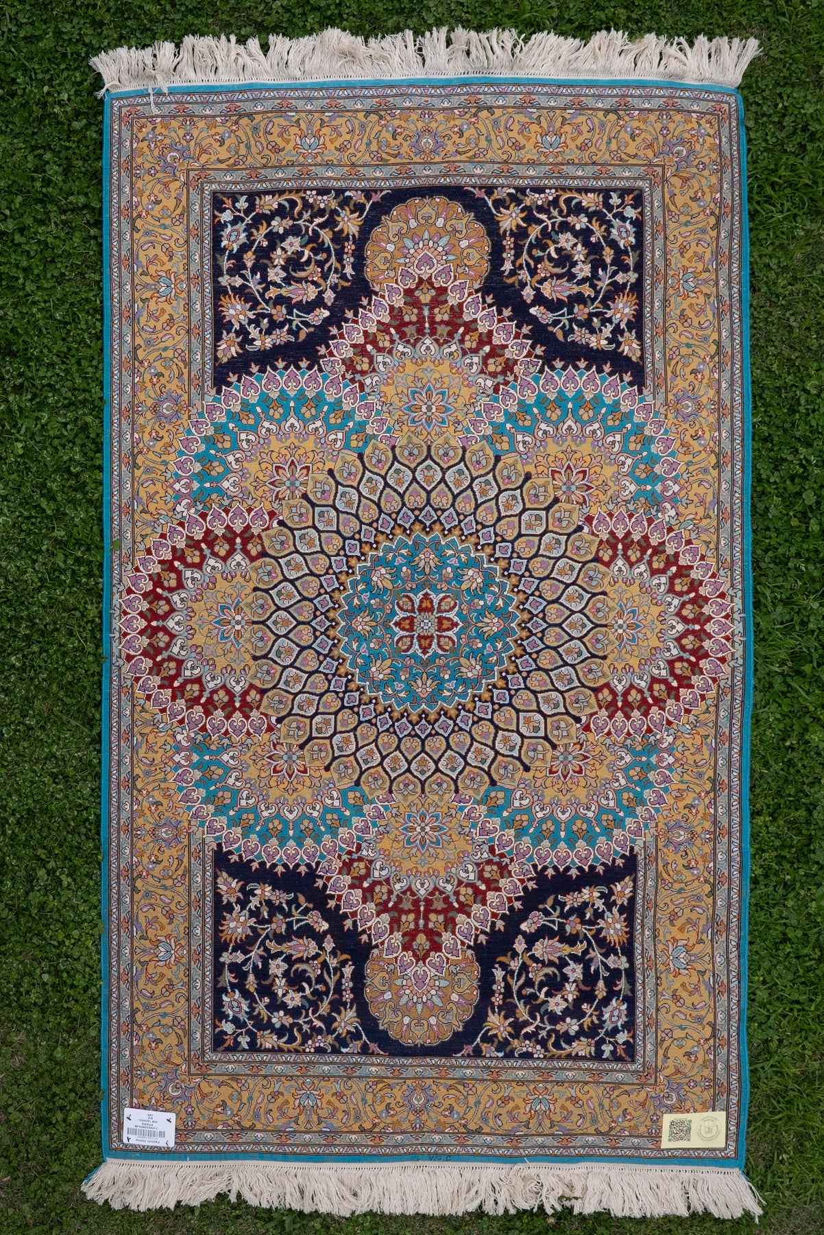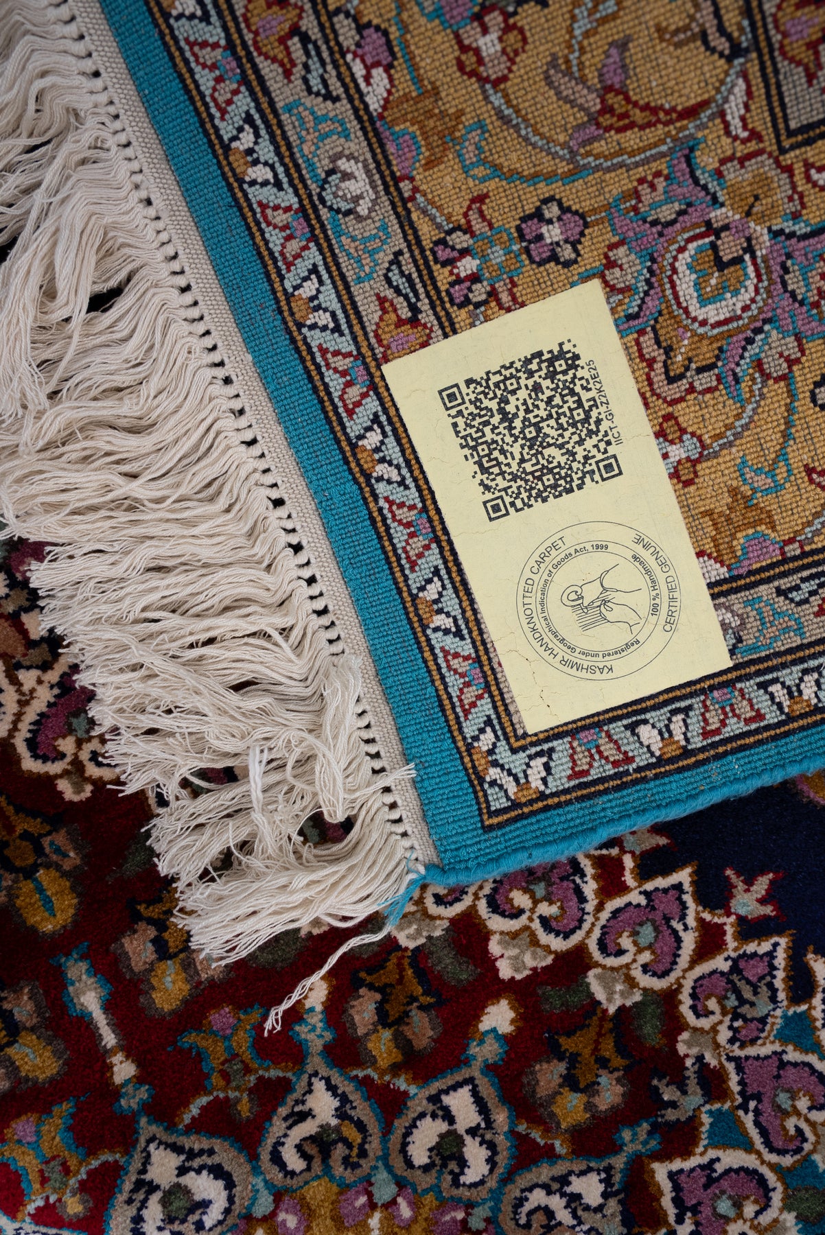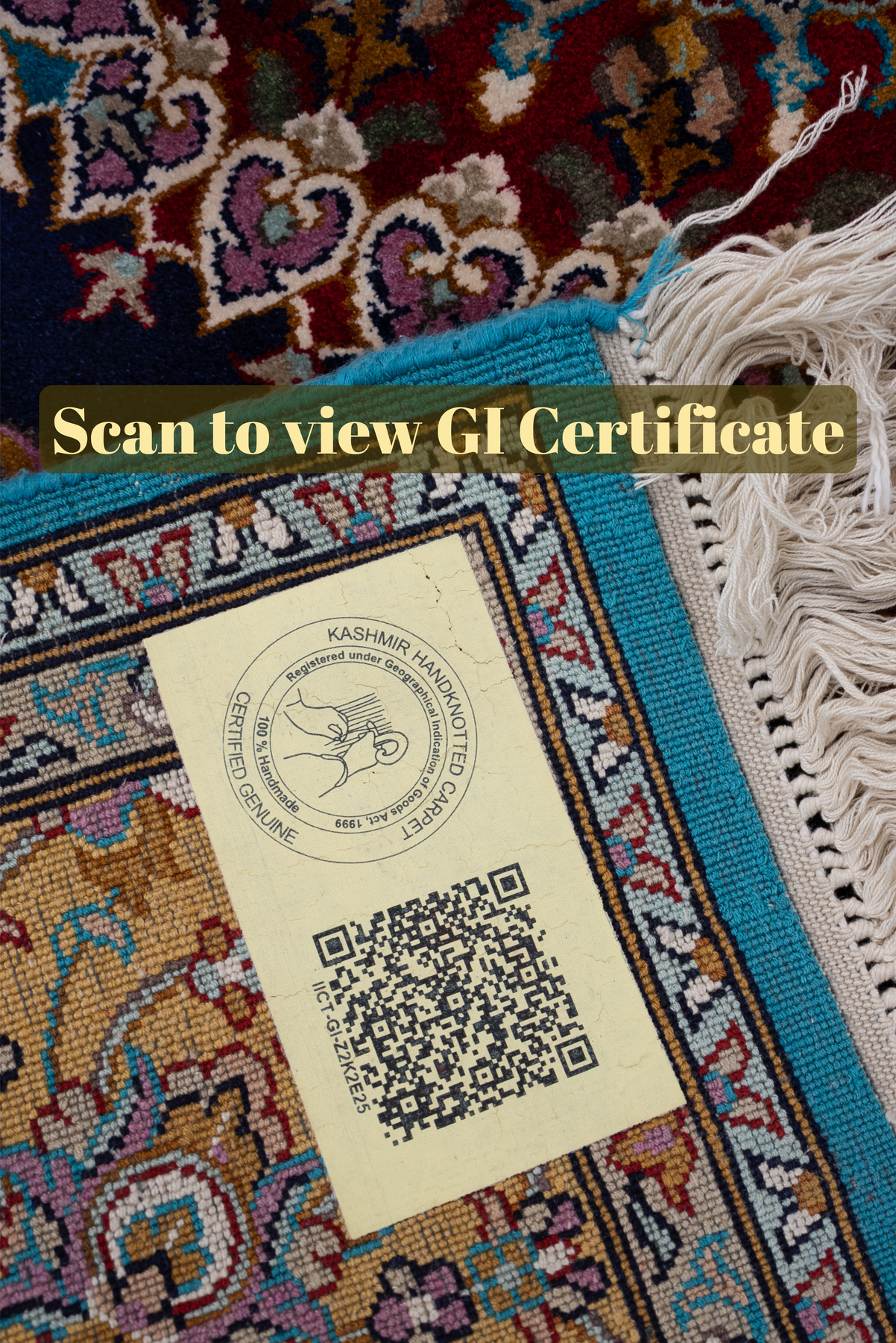 To guarantee authenticity, every Pure silk on silk carpet is accompanied by a Geographical Indication (GI) Certificate, issued by the Government of India. This certificate confirms that this carpet is a 100% Pure silk carpet and is Hand-knotted, and Hand-Crafted by local Artisans in Kashmir valley.