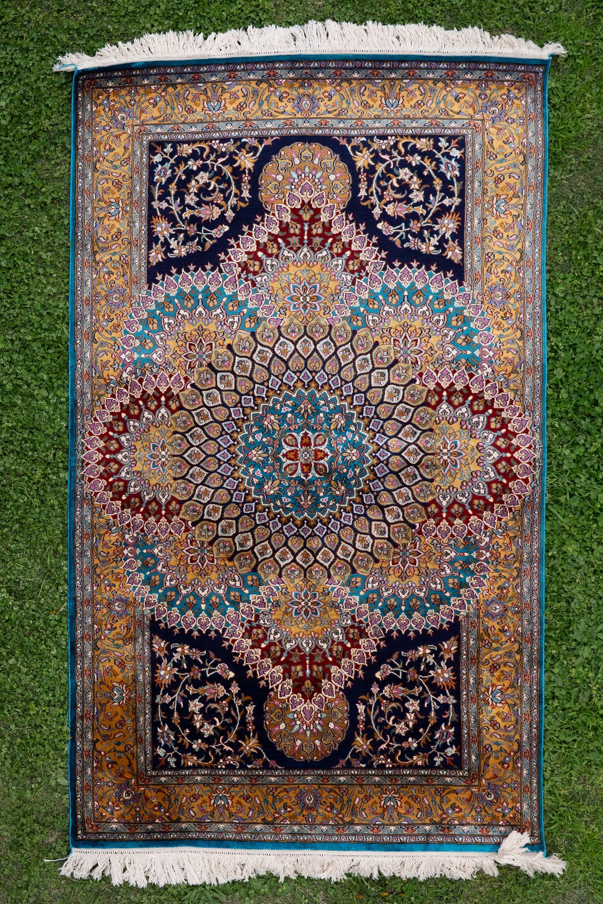 2.5ft x 4ft Regal Medallion Harmony: Hand Knotted Mulberry silk on silk Kashmiri Carpet
