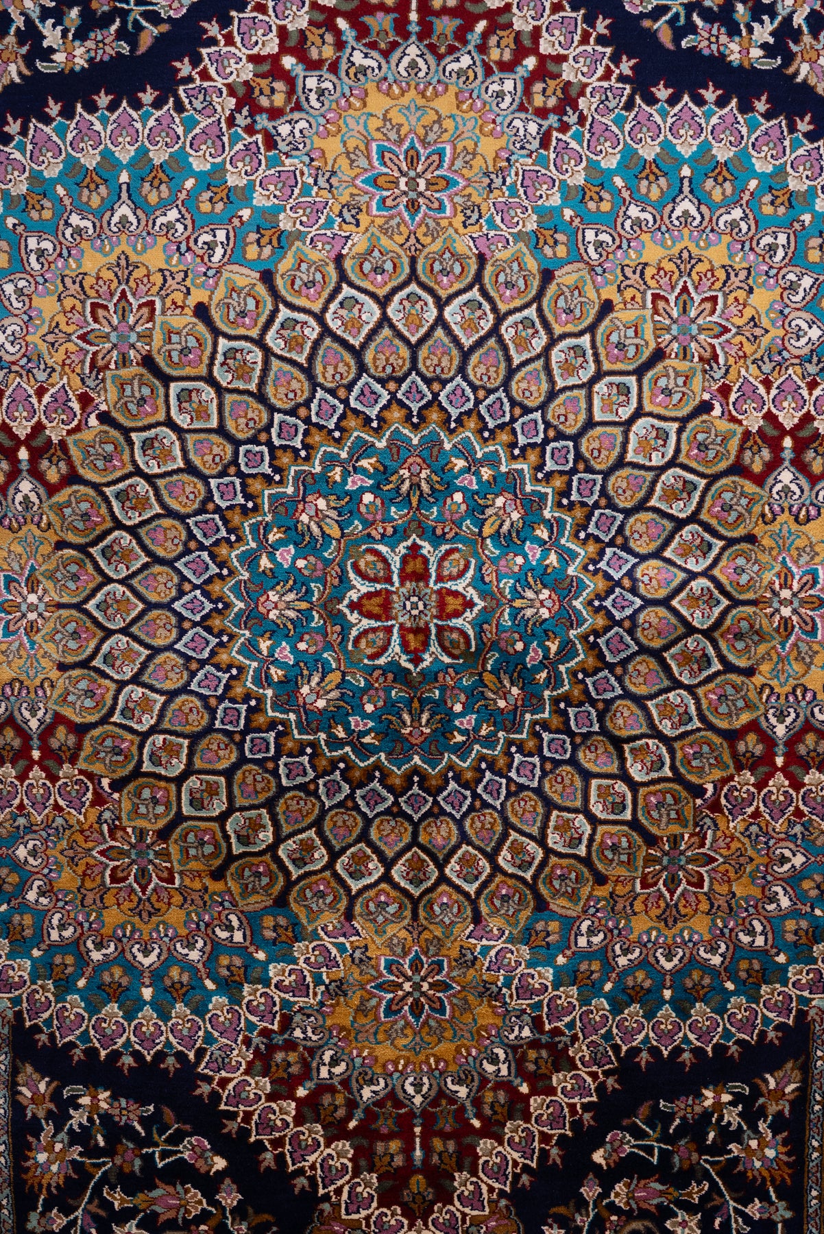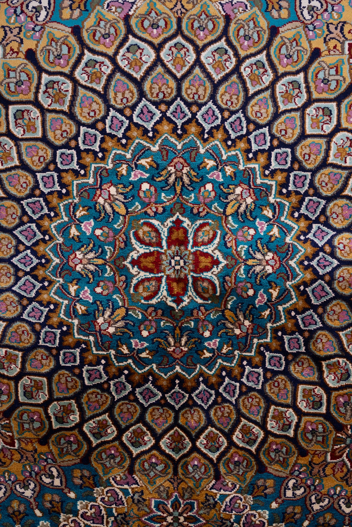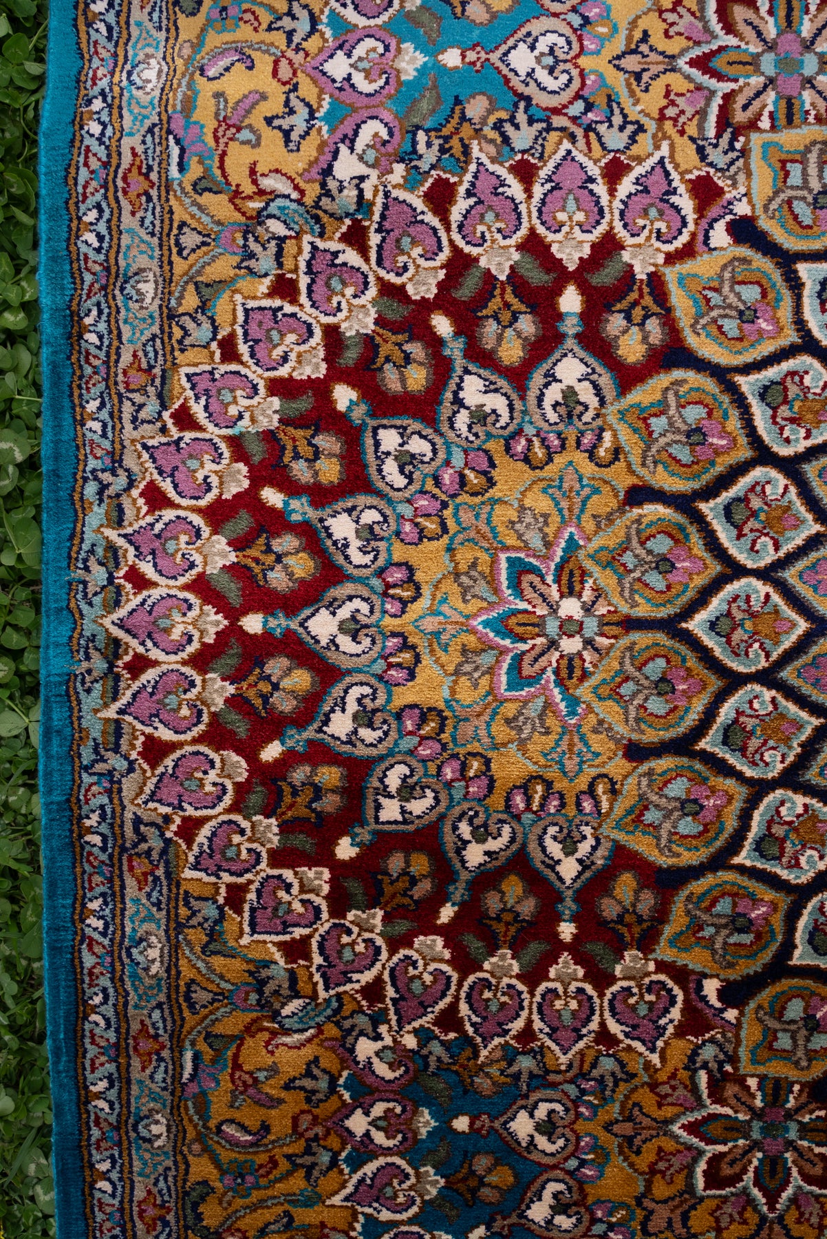 This carpet showcases a vibrant and detailed central medallion surrounded by layers of intricate floral patterns. The interplay of warm golds, blues, and reds creates a striking yet balanced composition.