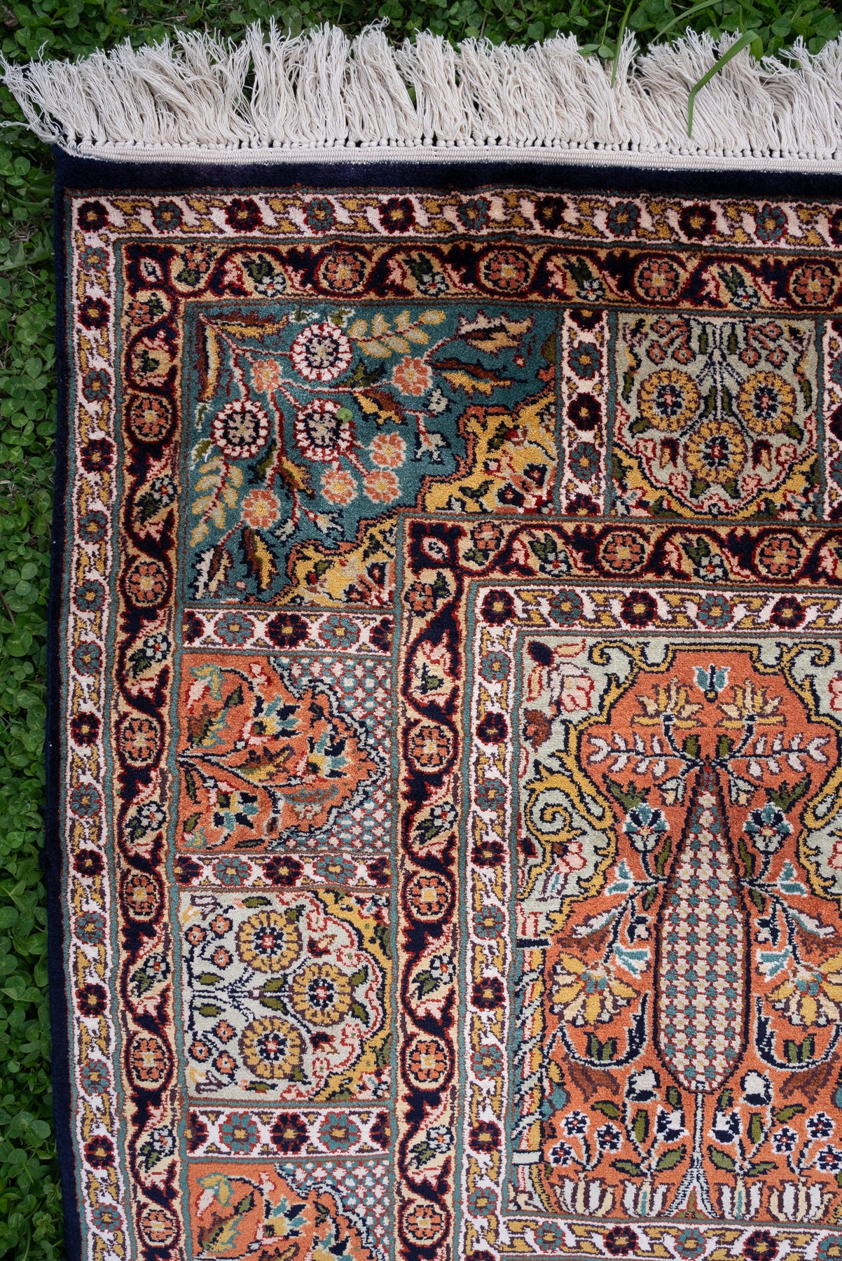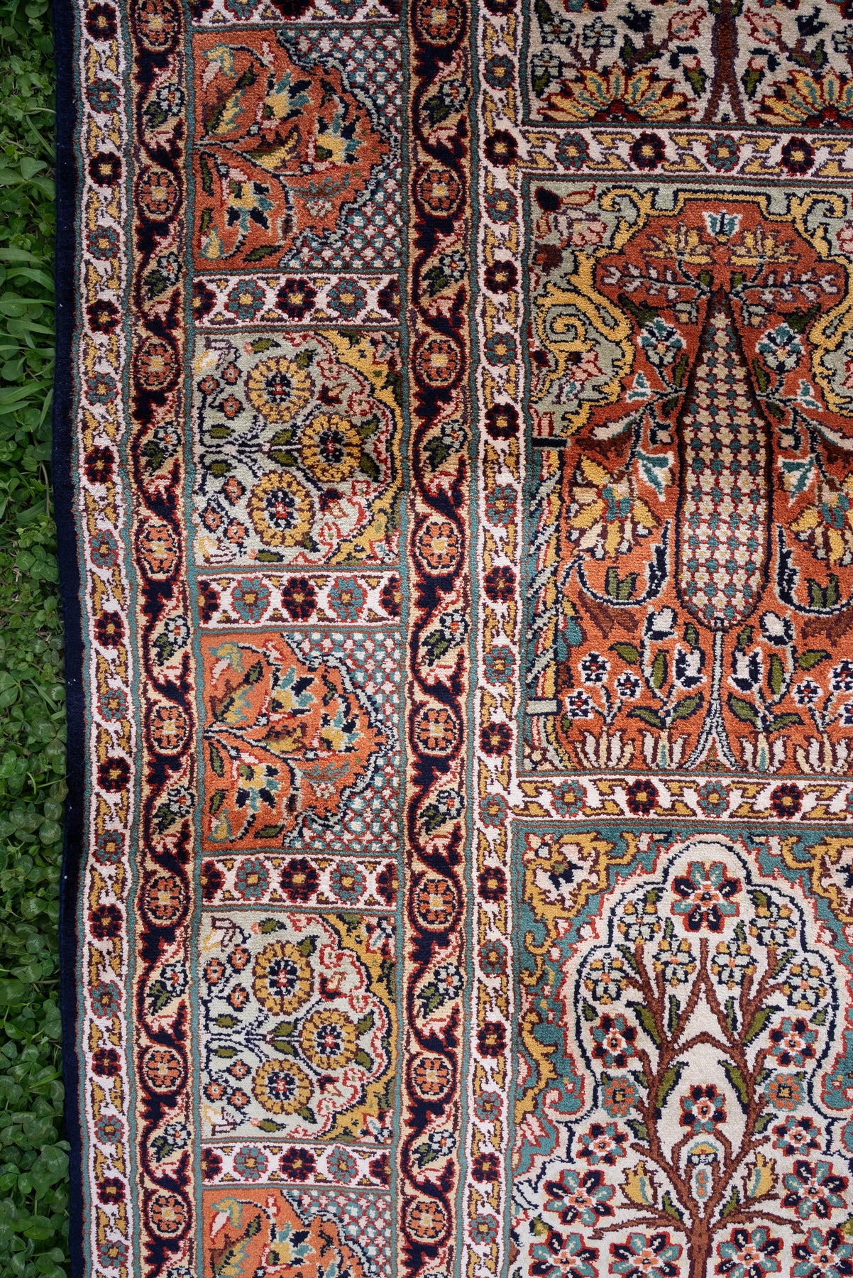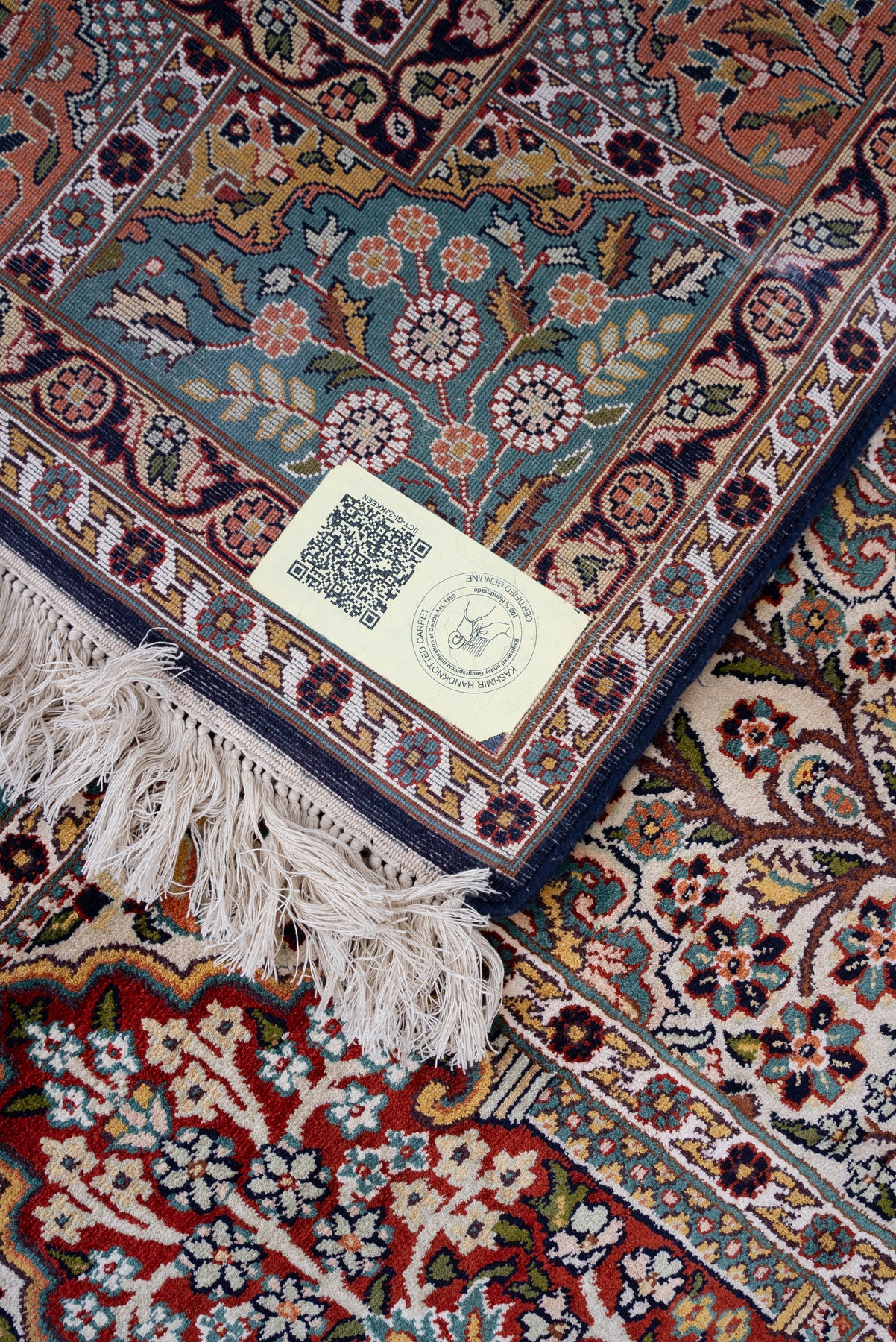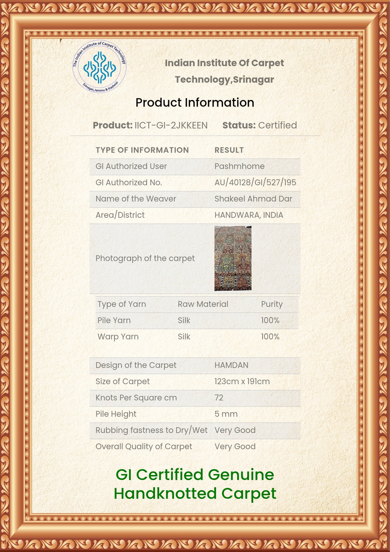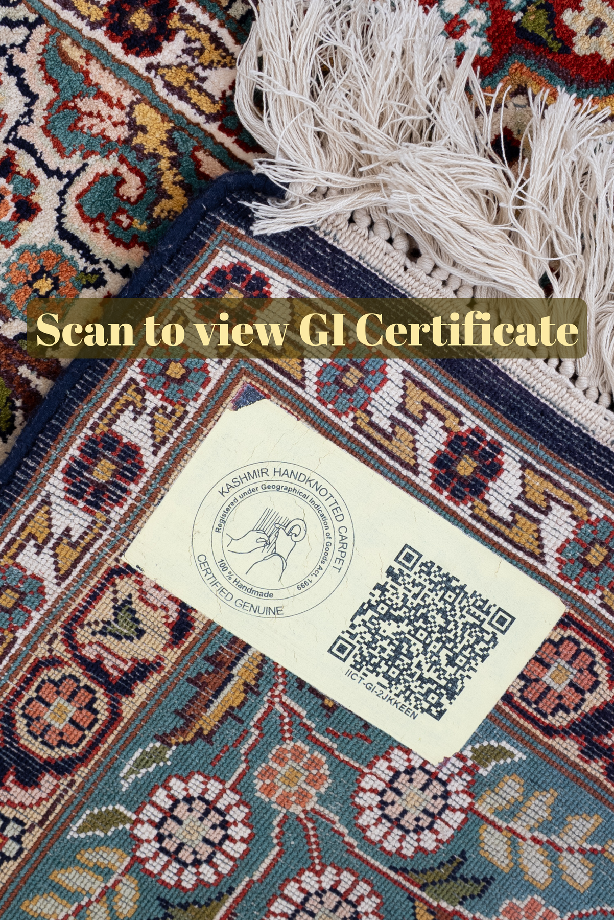 To guarantee authenticity, every Pure silk on silk carpet is accompanied by a Geographical Indication (GI) Certificate, issued by the Government of India. This certificate confirms that this carpet is a 100% Pure silk carpet and is Hand-knotted, and Hand-Crafted by local Artisans in Kashmir valley.