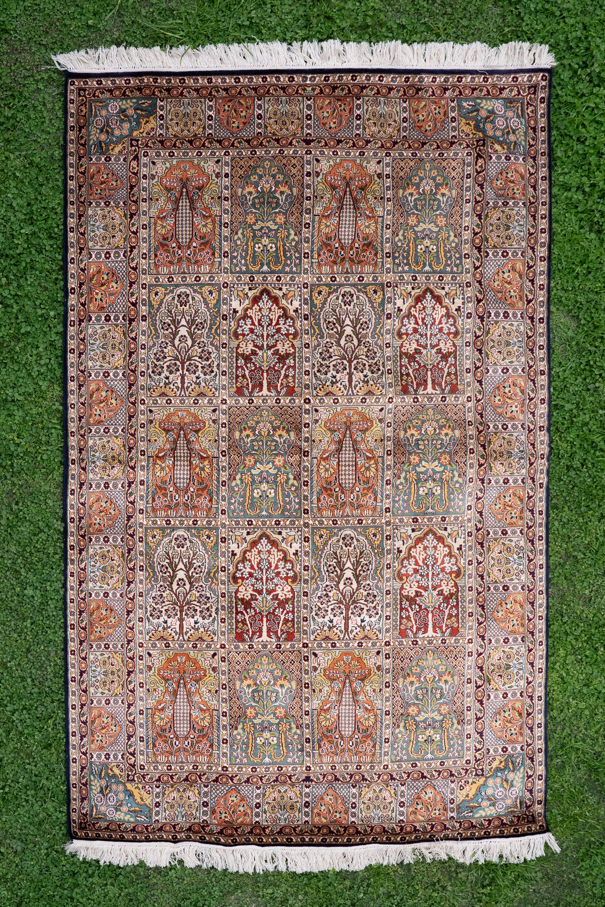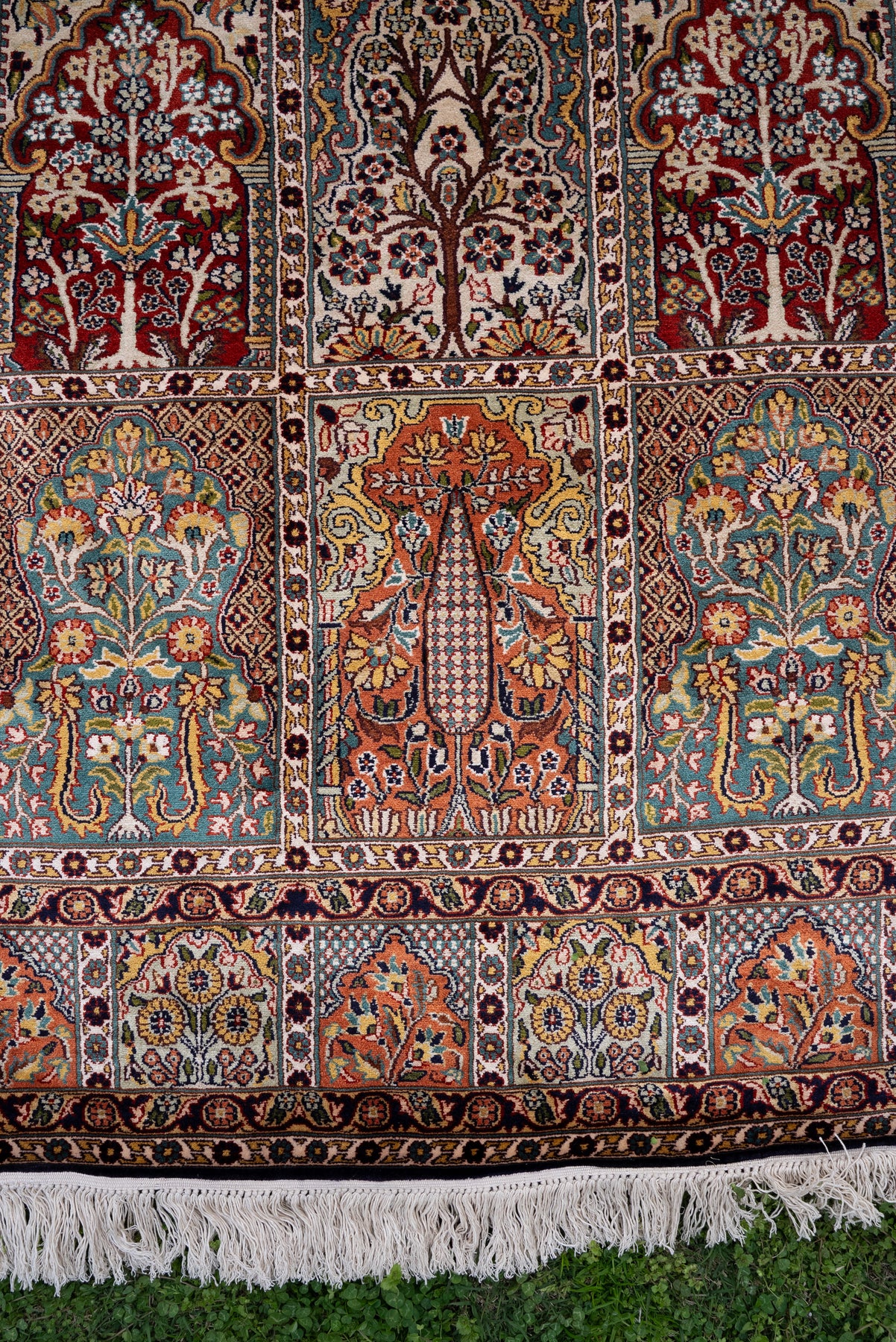 7ft * 5ft: Royal Garden Panel Tapestry: Hand Knotted Mulberry silk on silk Kashmiri Carpet