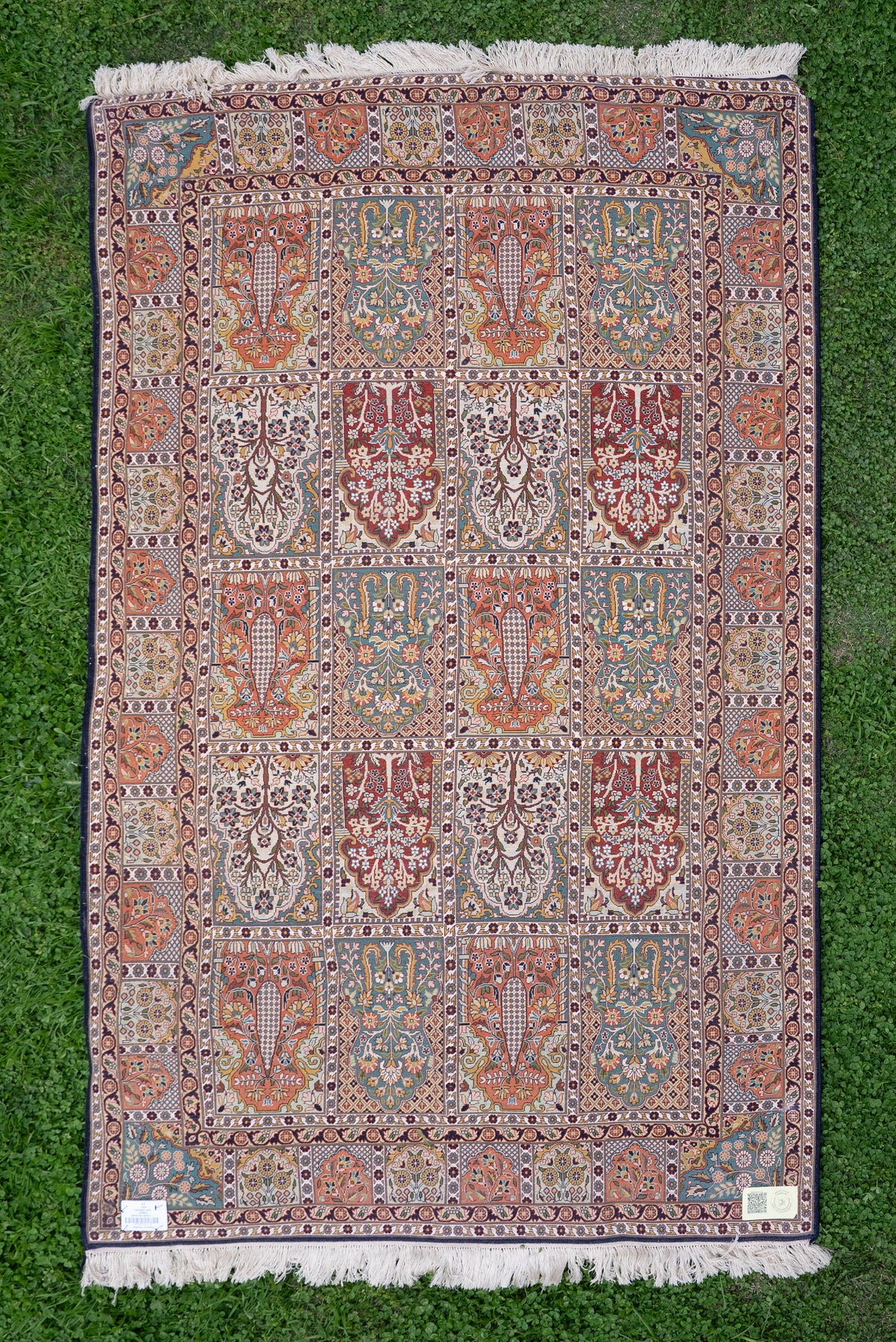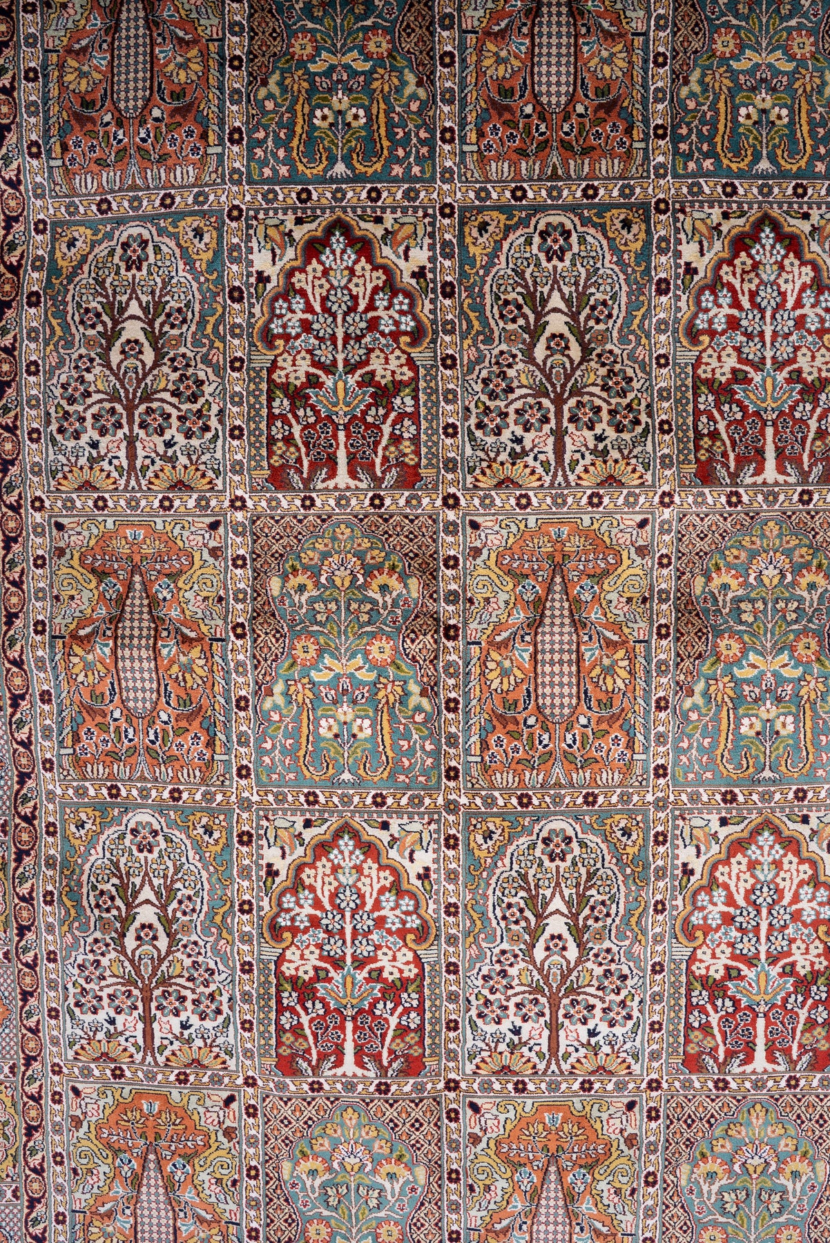 A beautifully structured composition, this carpet presents a series of ornate panels filled with floral and paisley-inspired motifs. The interplay of warm and cool tones creates a harmonious visual rhythm that feels both traditional and richly decorative.